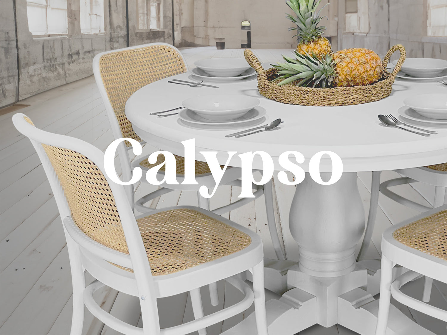 The Calypso Chair incorporates a rattan seat and backrest, along with a single hoop supporting the legs for both strength and a contemporary silhouette. Its distinguishing feature lies in the thick edge of the seat, providing a luxurious appearance that sets it apart from other chairs.