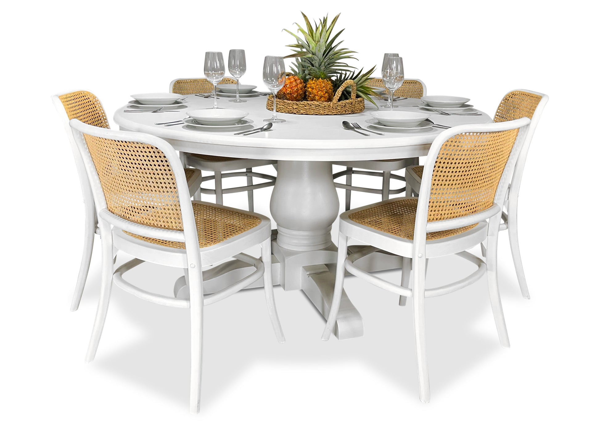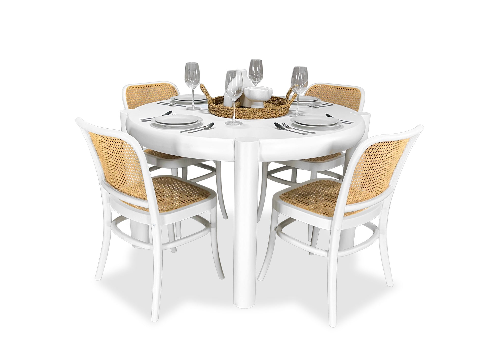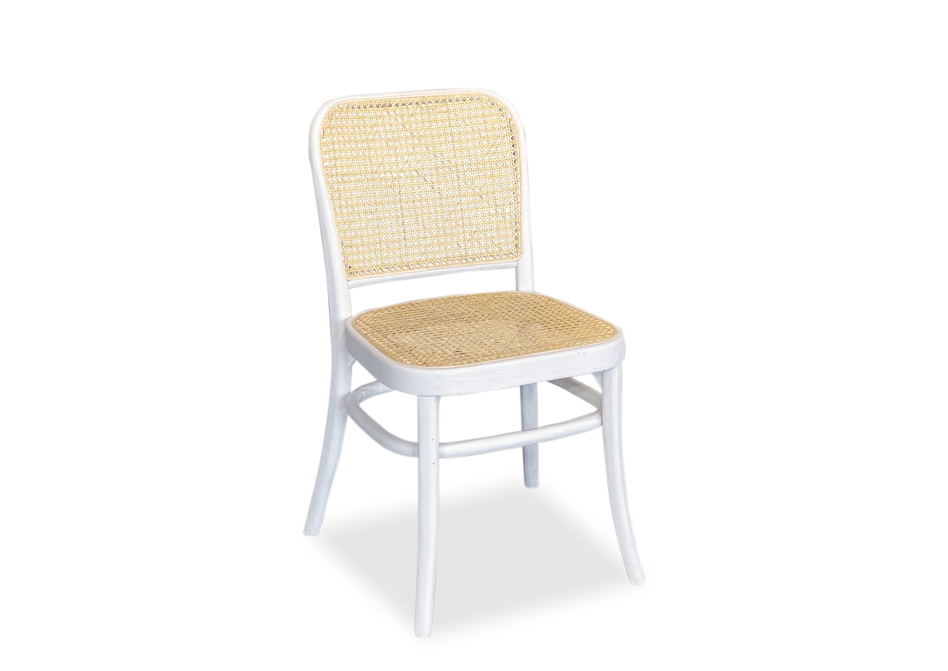 The Calypso Chair features a rattan seat and back rest, and a single hoop between the legs, giving it strength and a modern silhouette. The thick edge of the seat sets it apart from other chairs with a deluxe look.