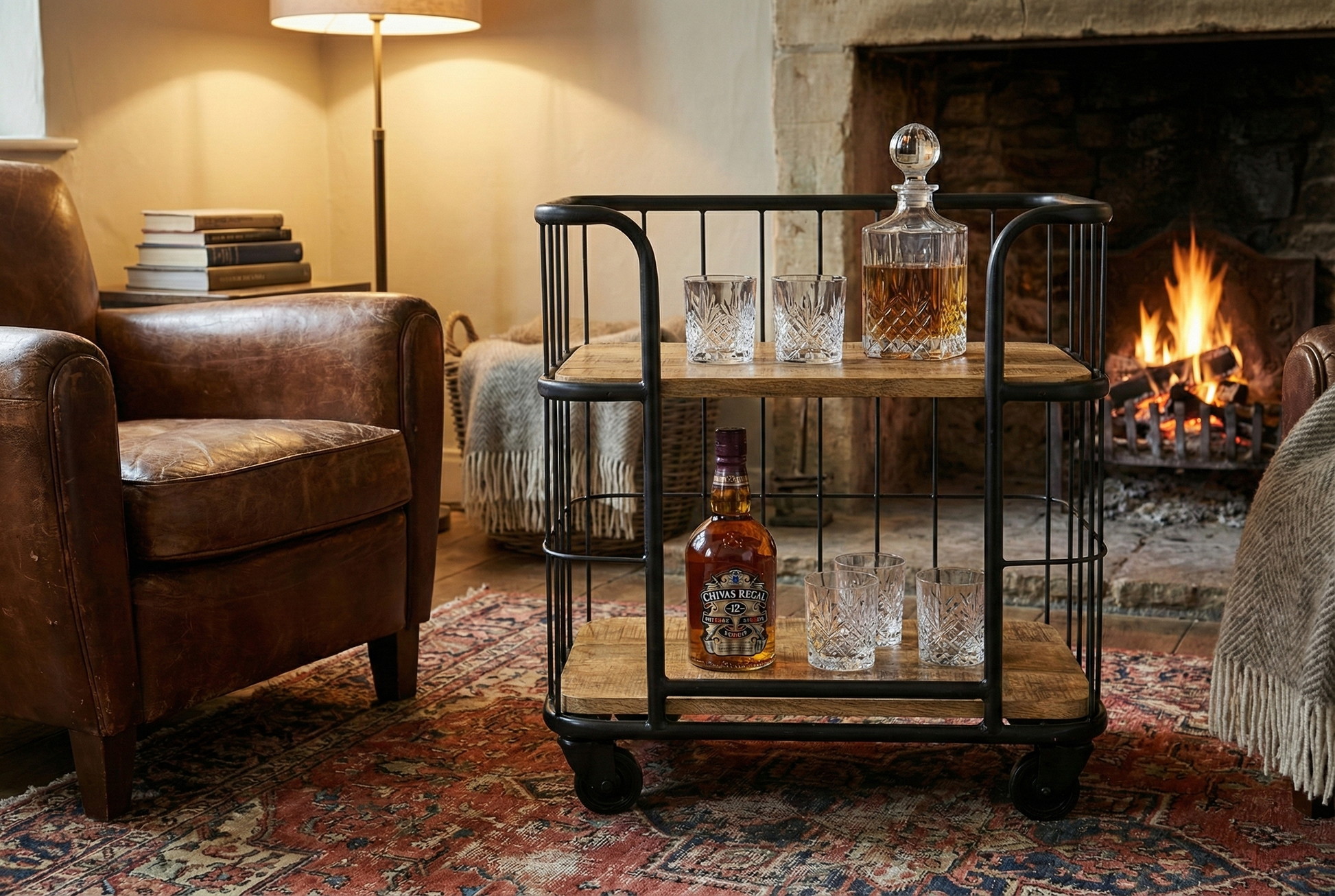 The Forge Bar Cart is a simple industrial piece that is made from sustainable mango wood and steel.