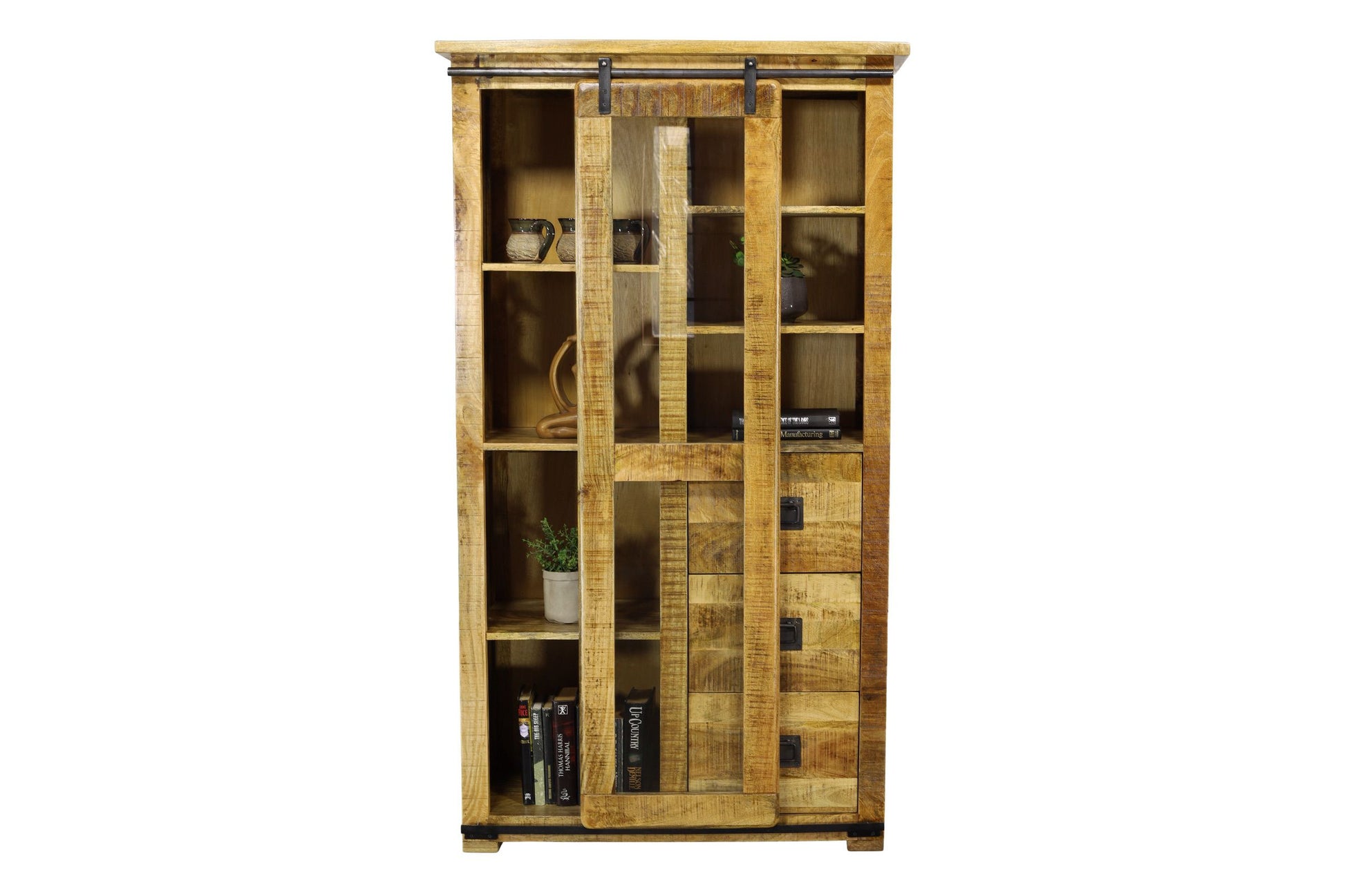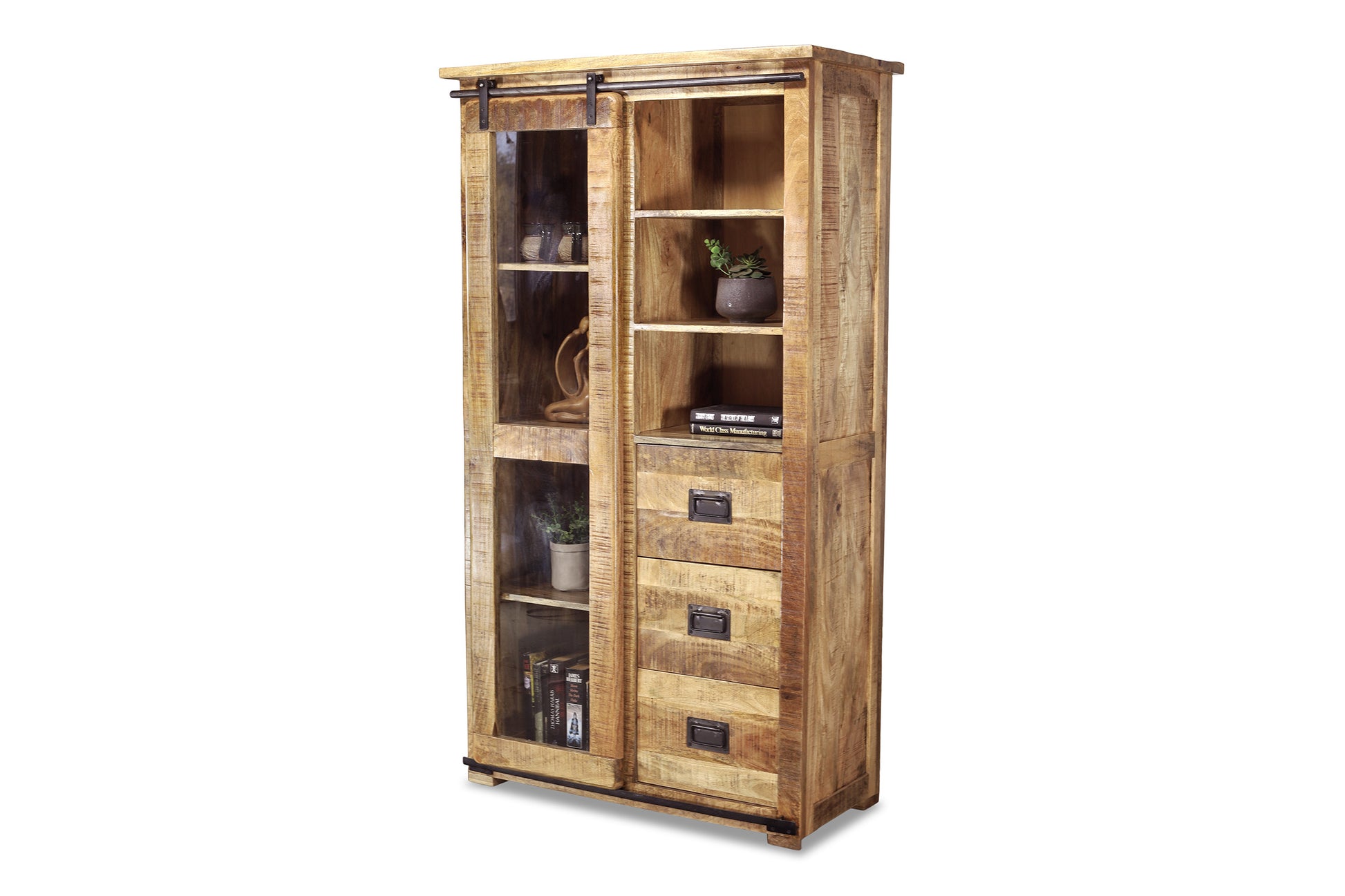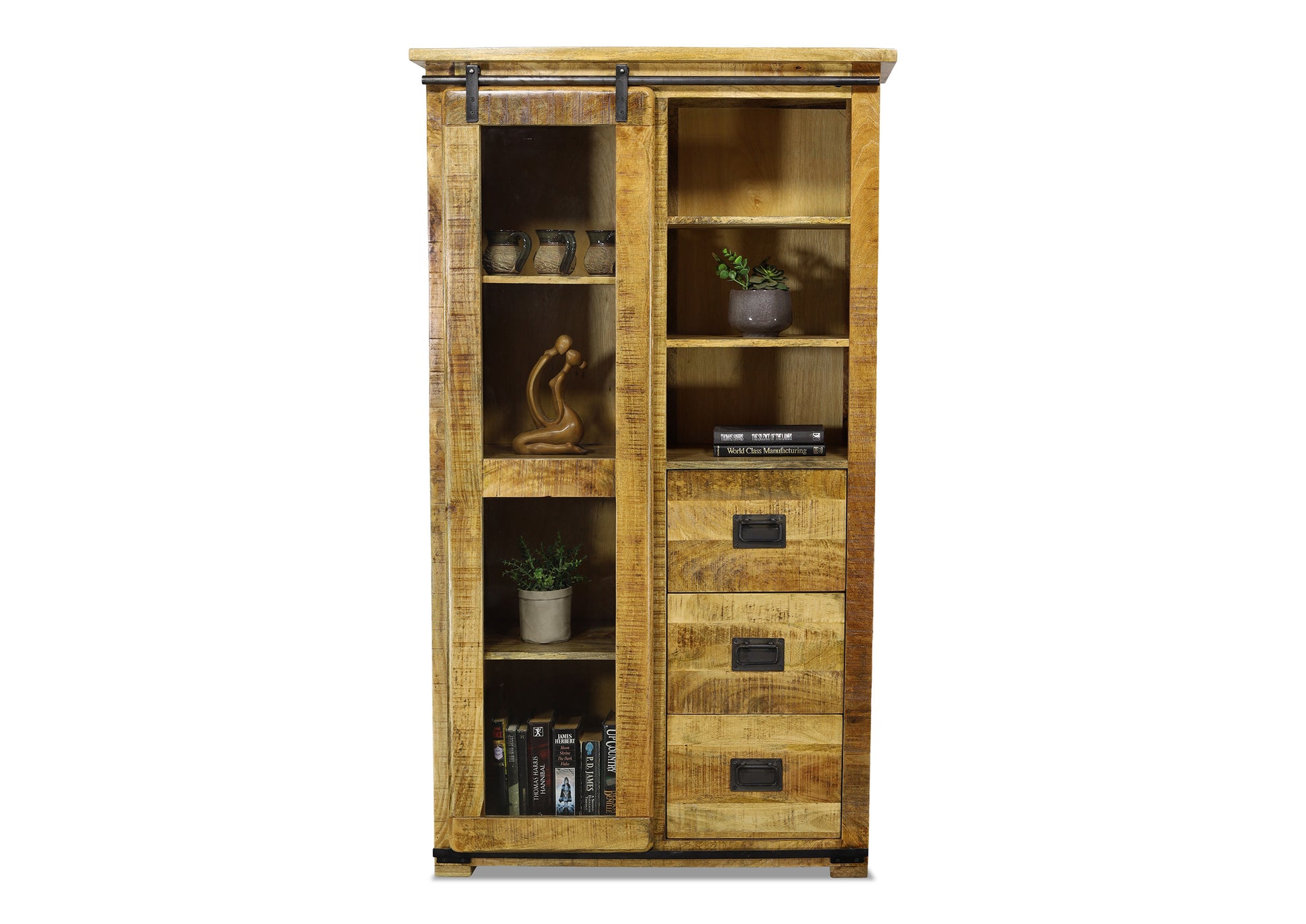 The Forge Display Cabinet is a classic industrial piece that is made from environmentally responsible mango wood. The Forge Display Cabinet features a stunning glass barn door with timber frame.