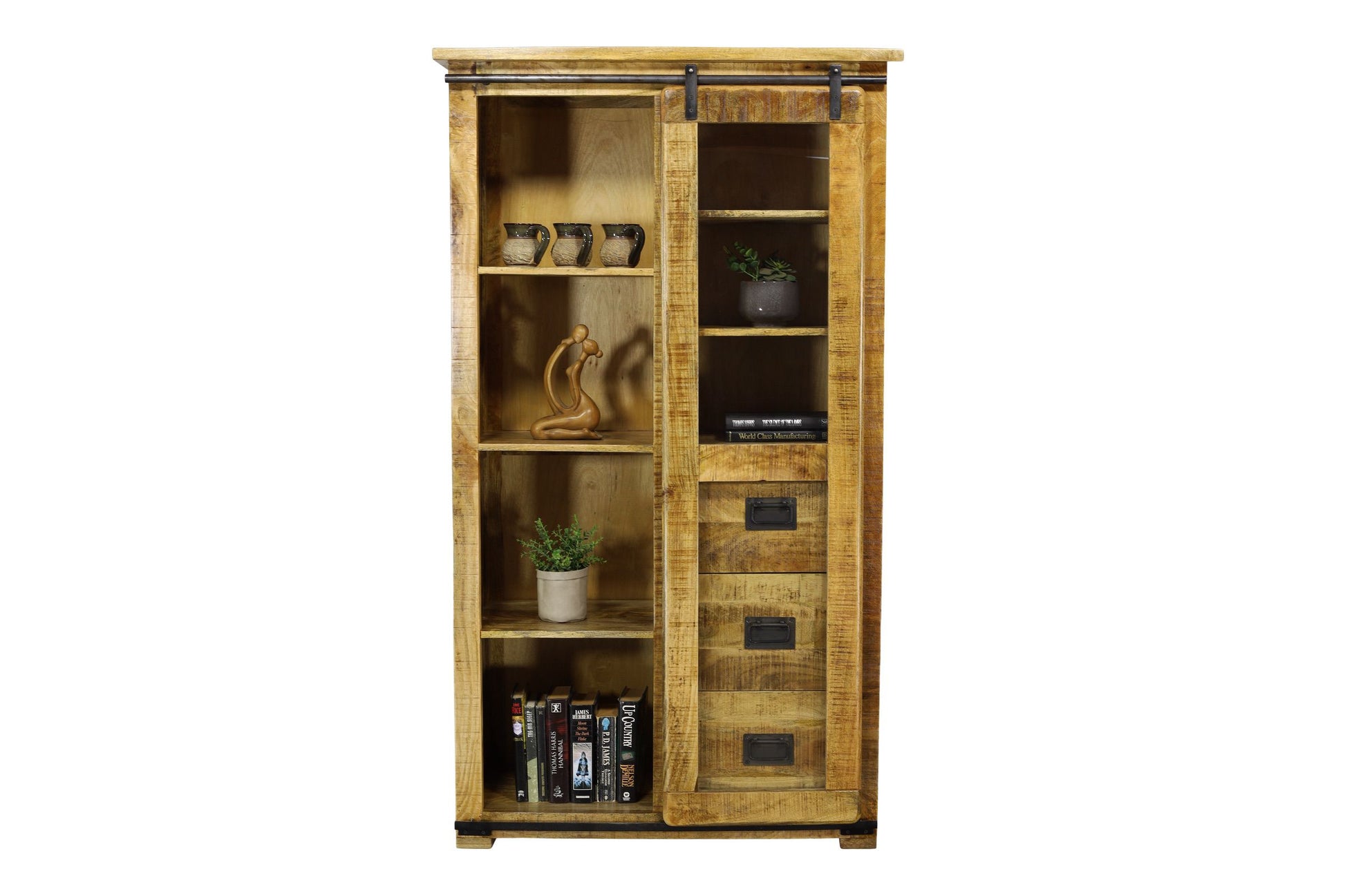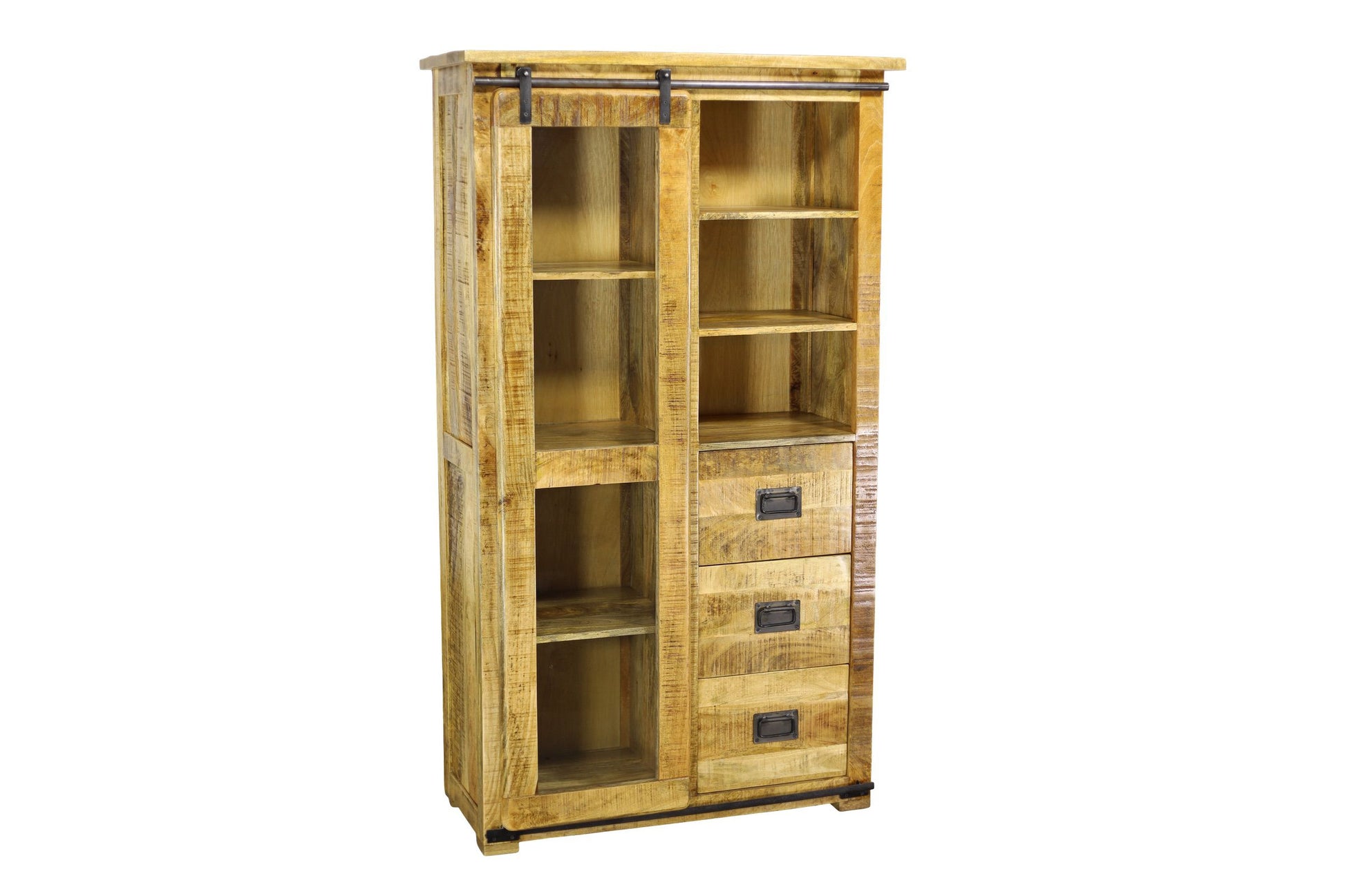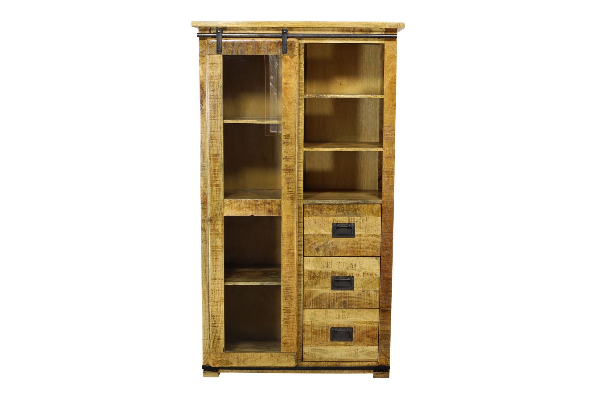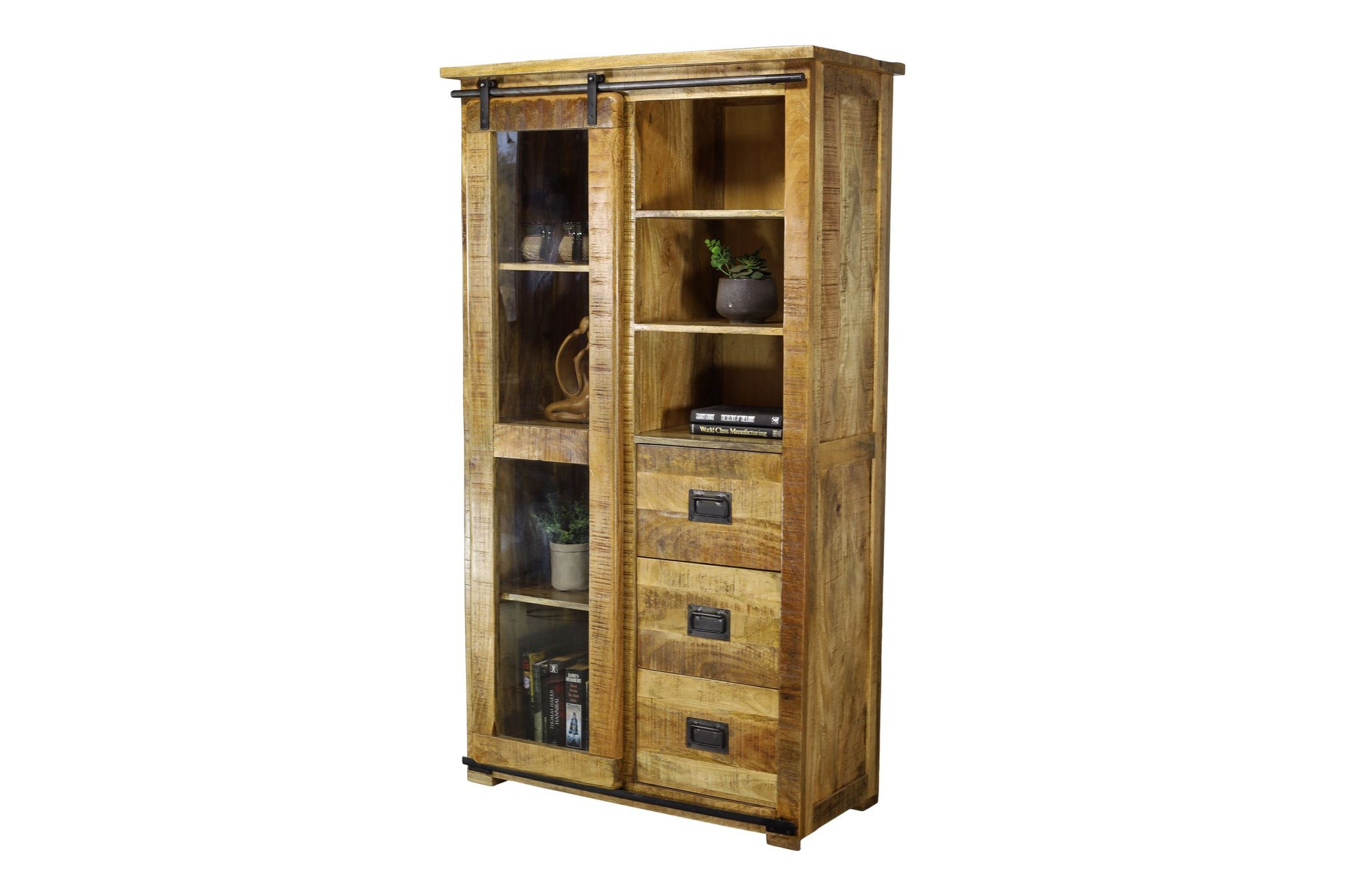 The Forge Display Cabinet is a classic industrial piece that is made from environmentally responsible mango wood. The Forge Display Cabinet features a stunning glass barn door with timber frame.