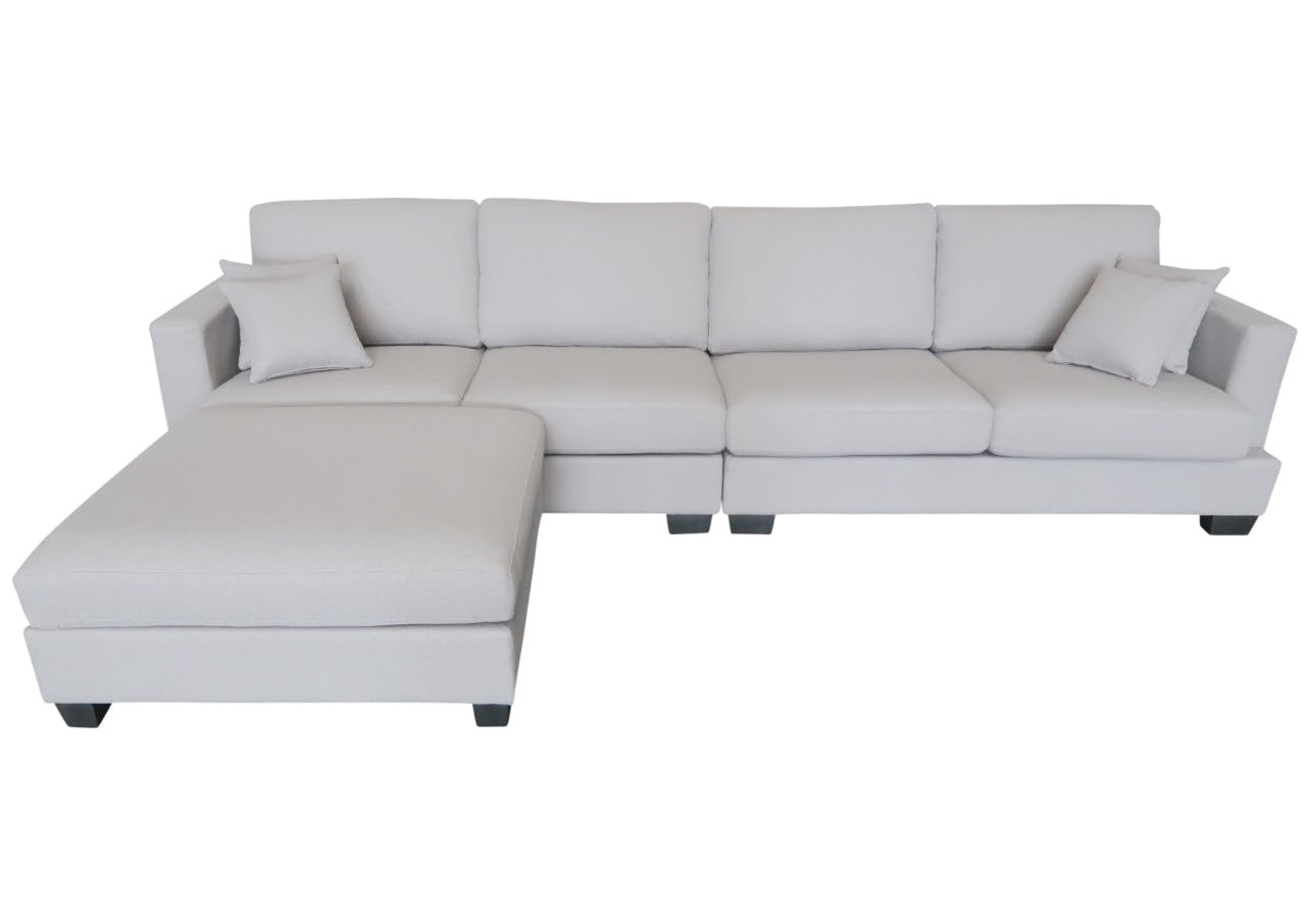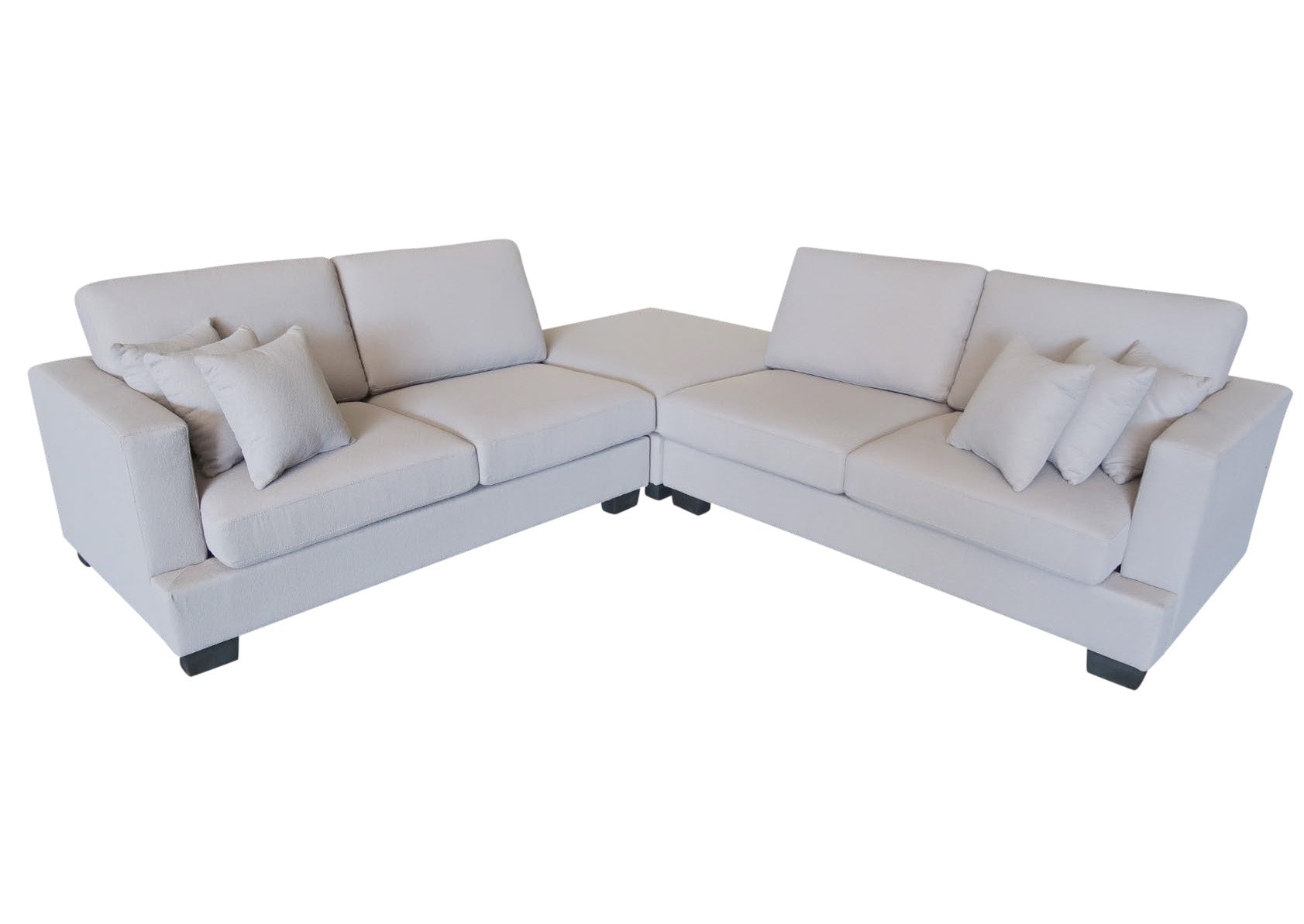 The Genesis Modular Sofas is made up of a left two-seat section, a right two-seat section and an ottoman. The construction is timber and plywood frame with bonnell springs. It is upholstered in a light grey boucle fabric.