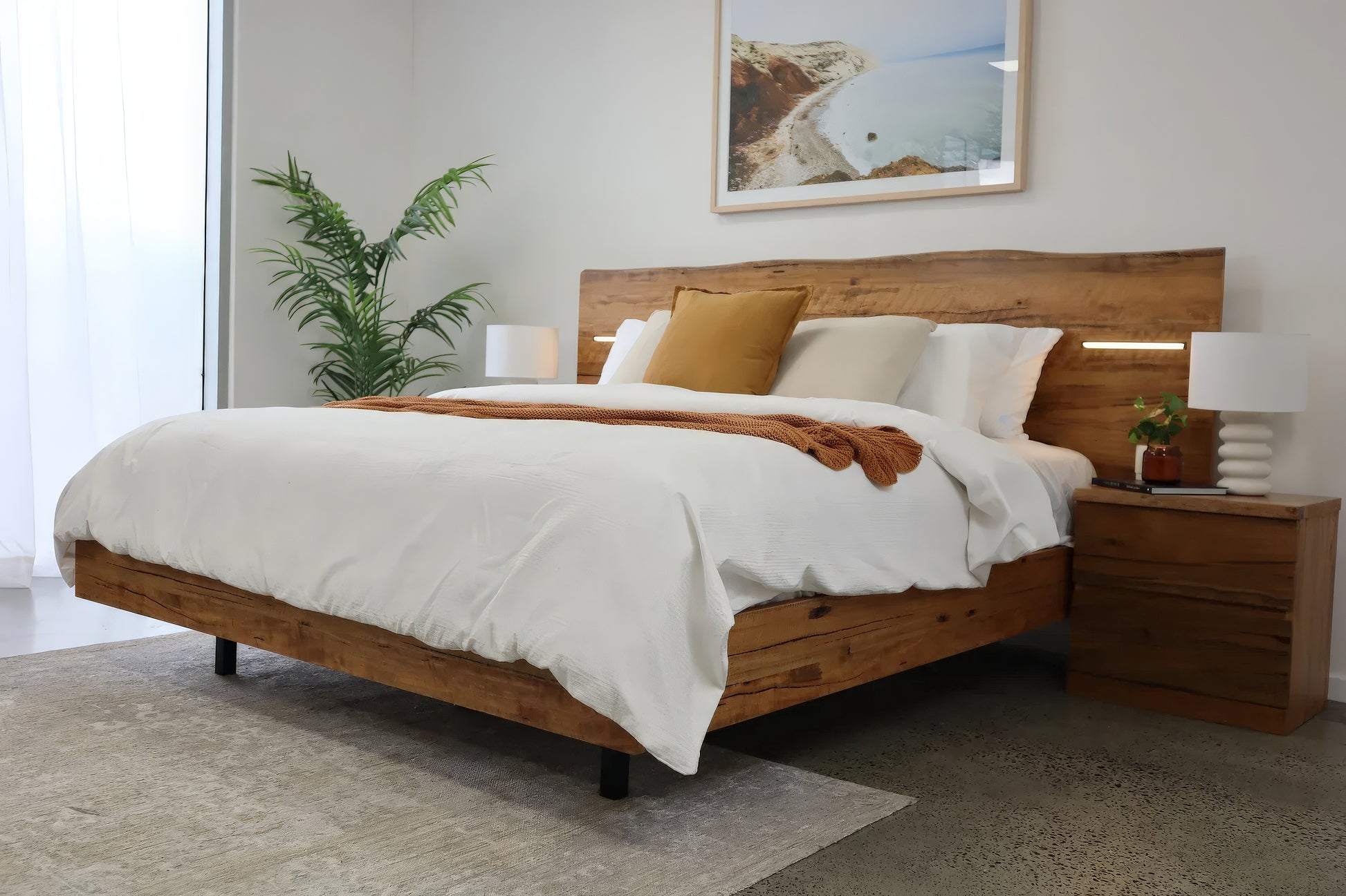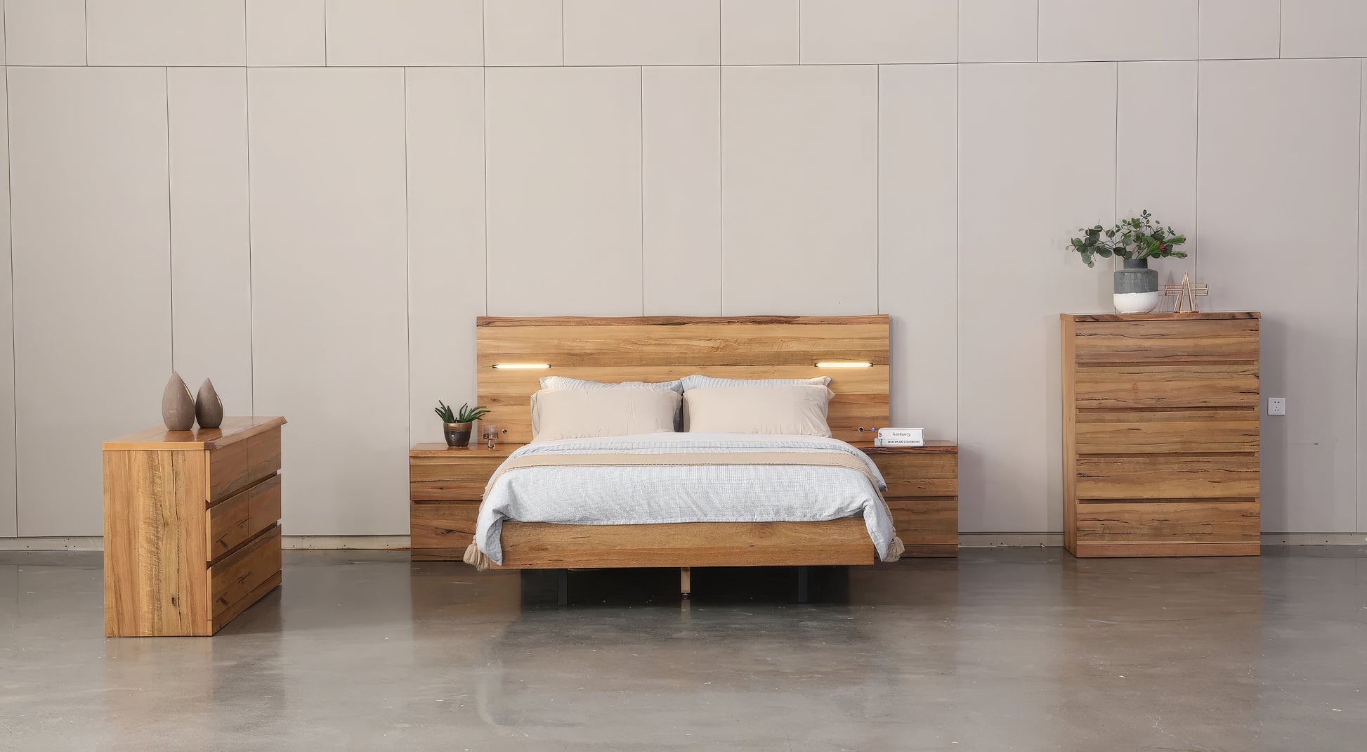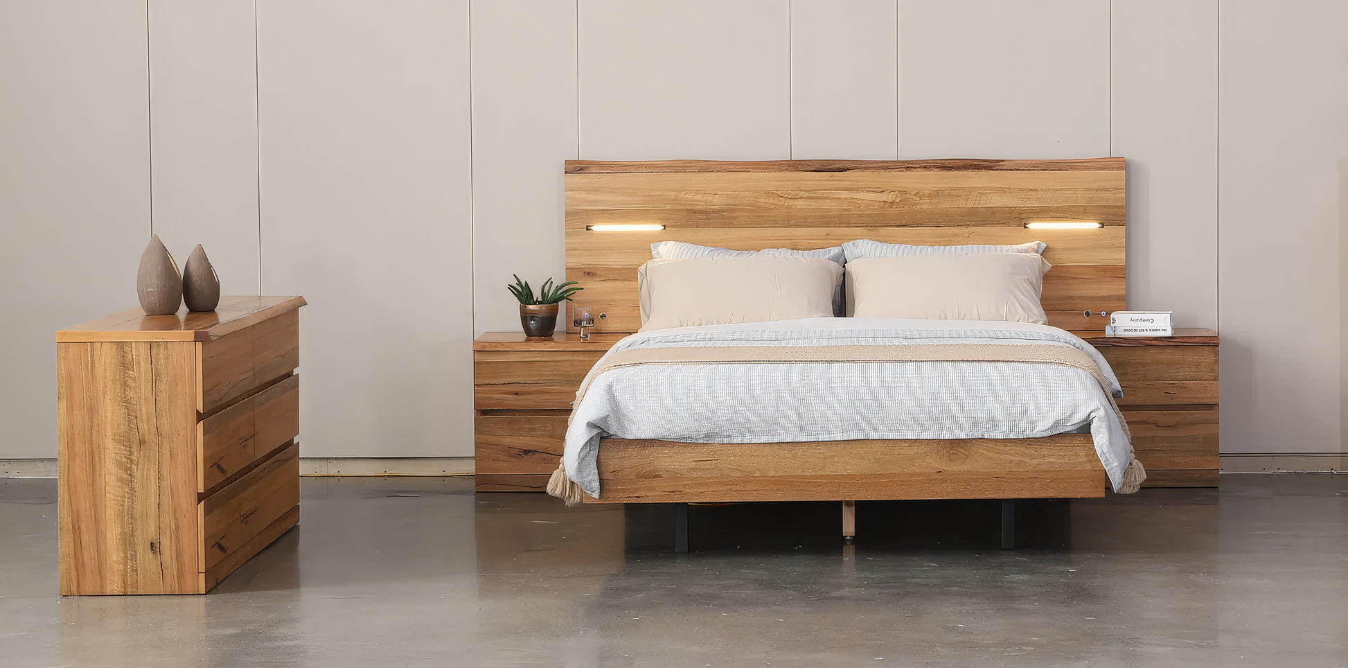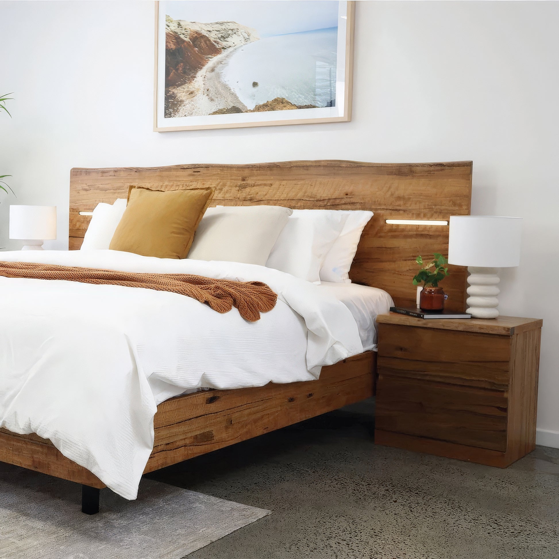 Crafted from striking Marri timber, the Harvest range brings natural warmth and bold character to the bedroom. Featuring rich grain patterns and organic lines, each piece showcases the raw beauty of Australian hardwood. The bed includes integrated ambient lighting and dual USB charging ports for a modern touch of convenience.