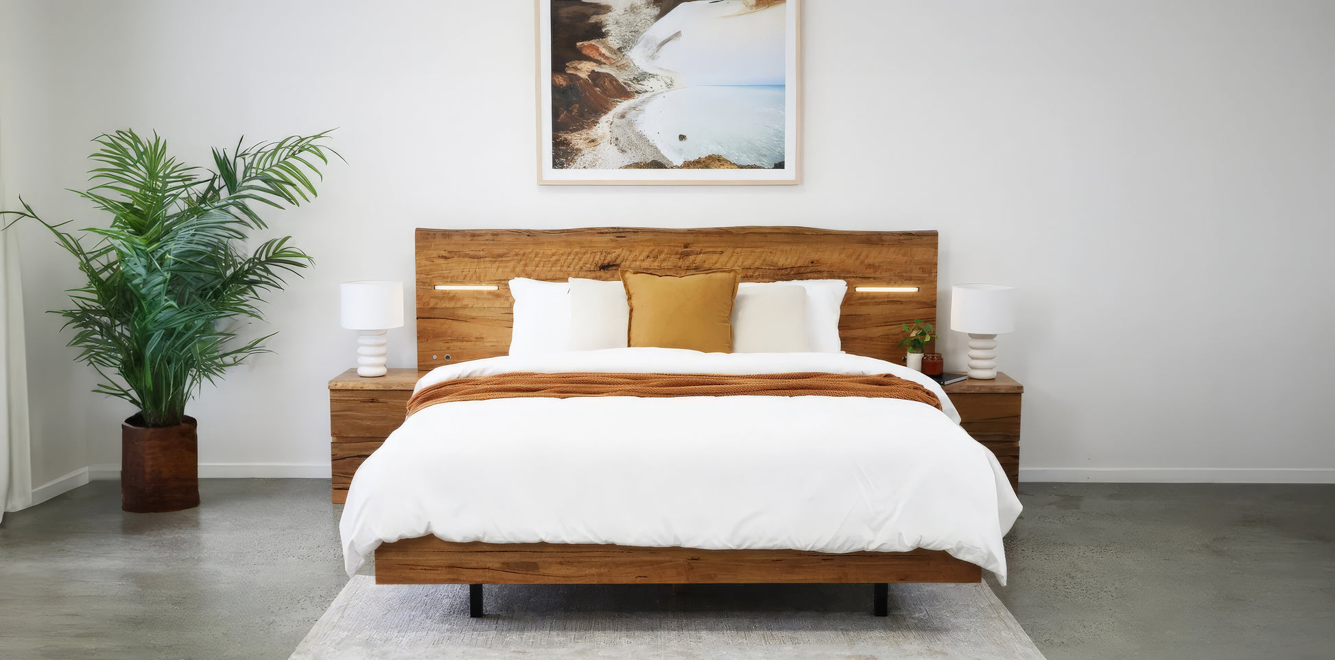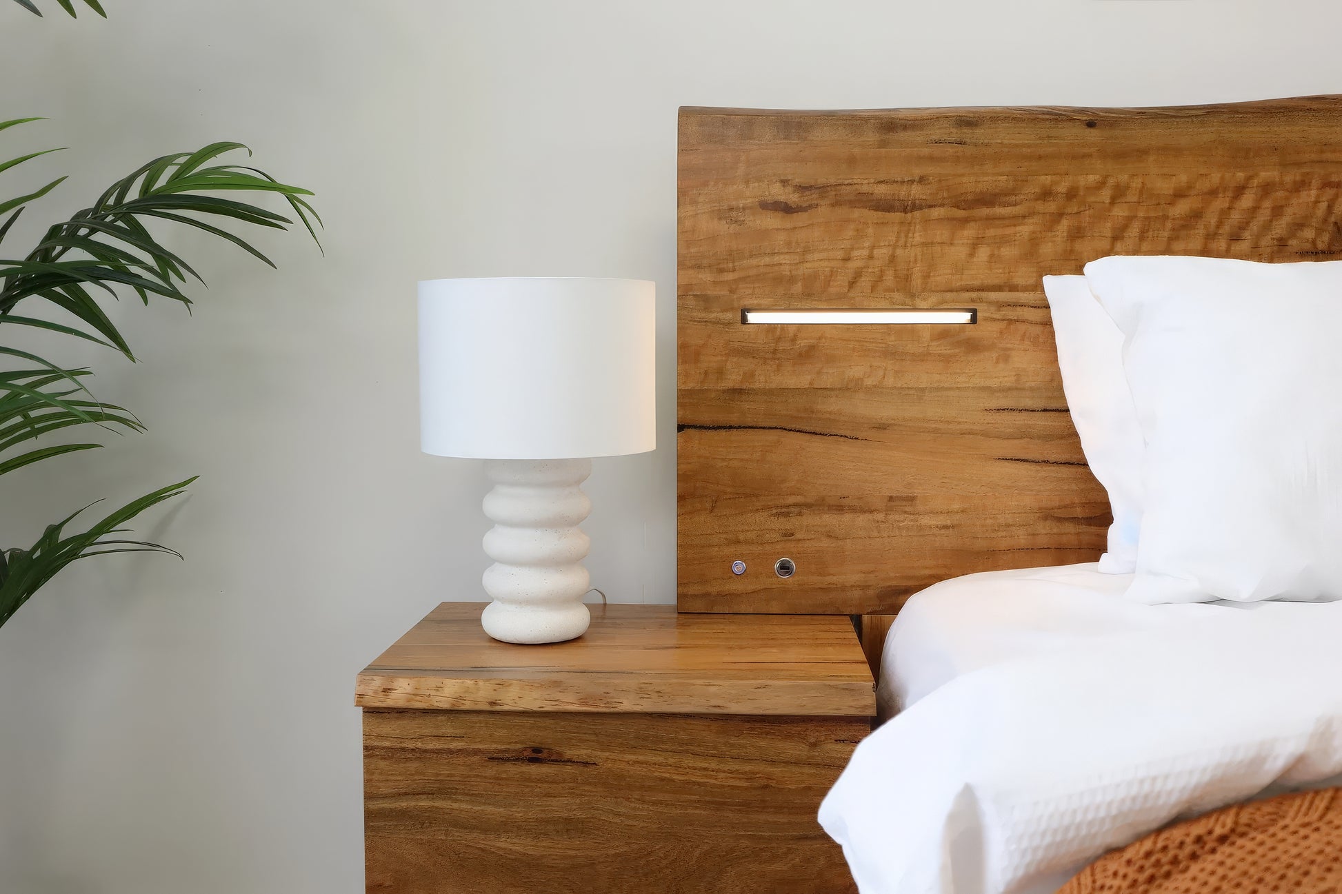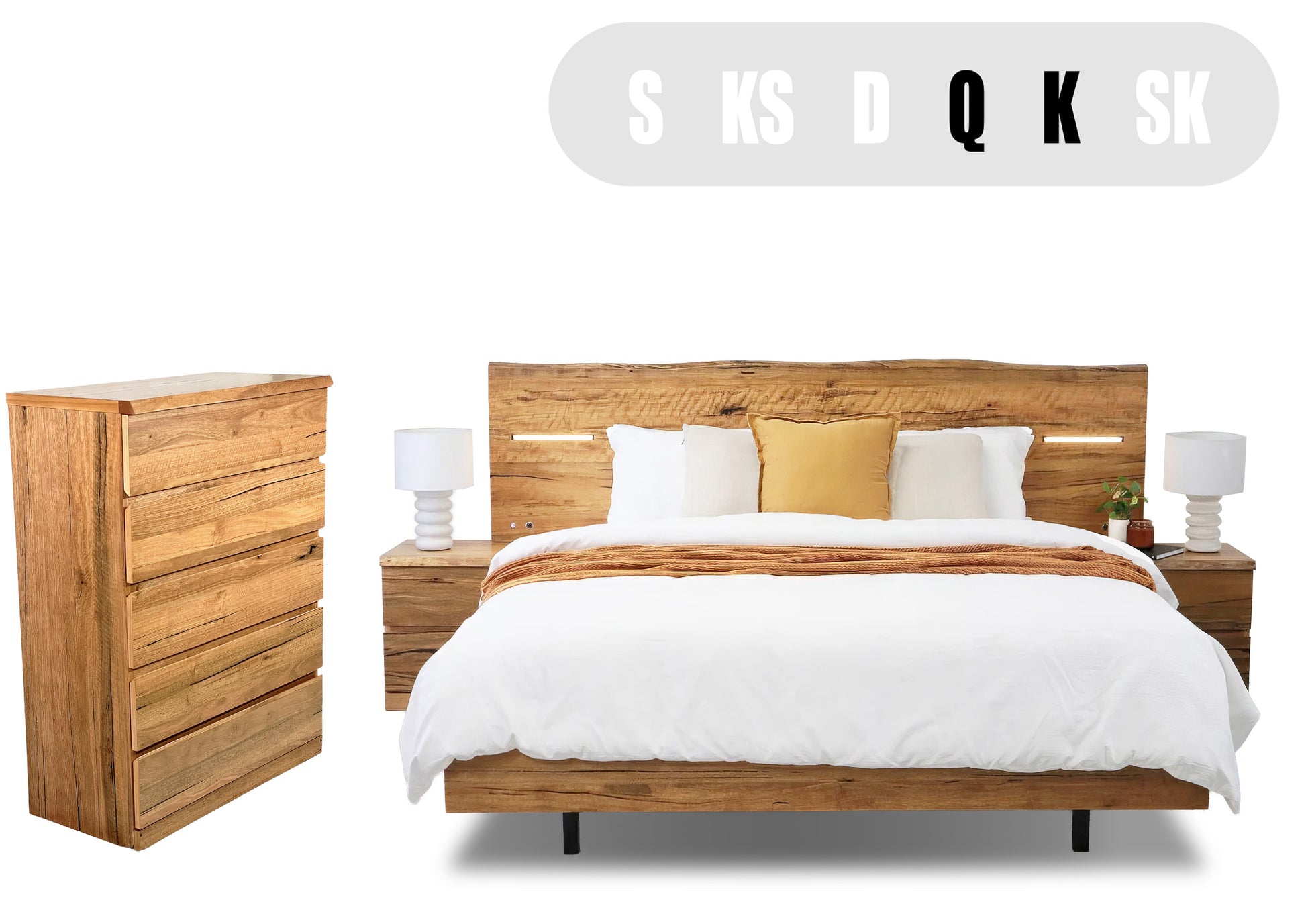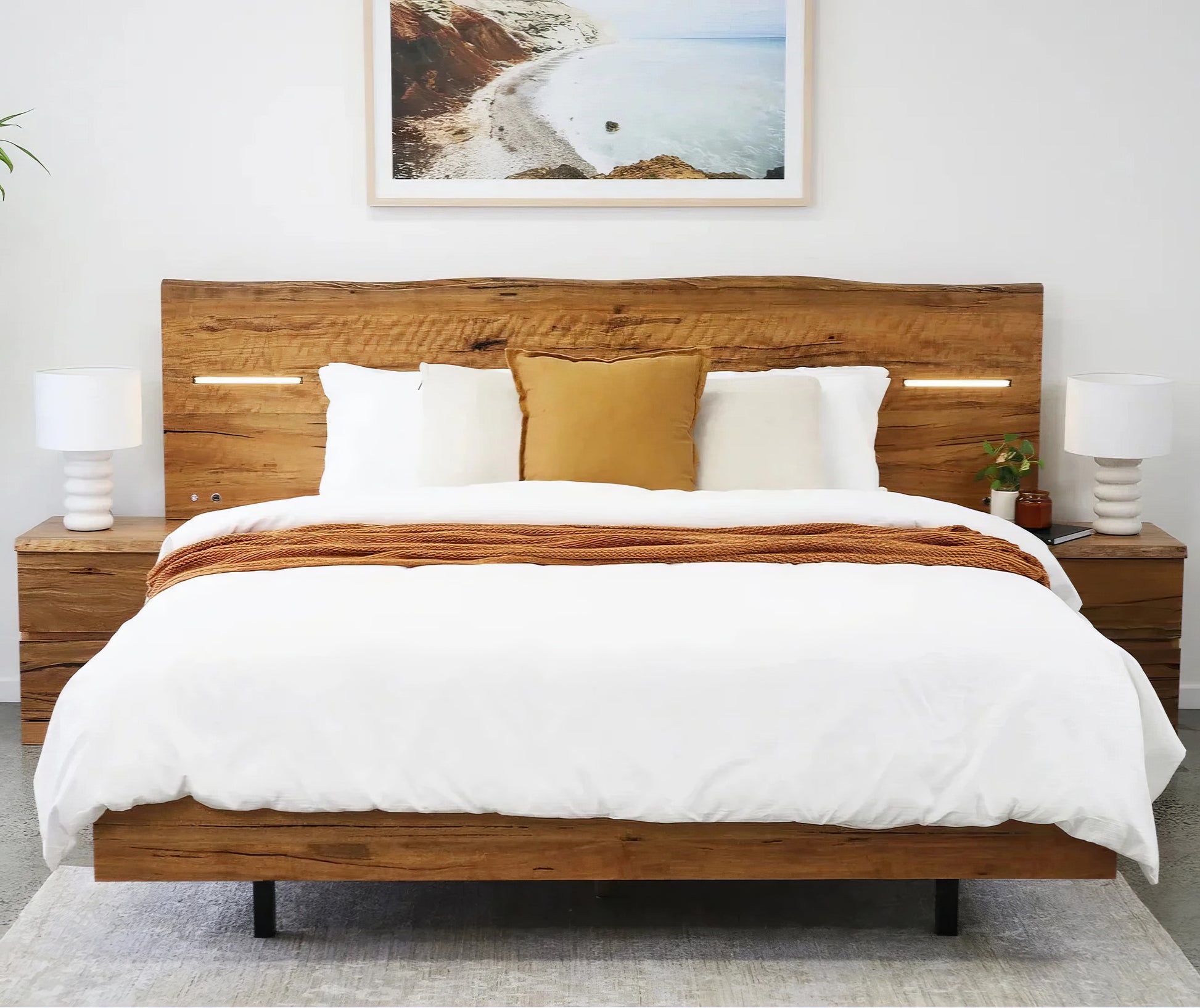 Crafted from striking Marri timber, the Harvest range brings natural warmth and bold character to the bedroom. Featuring rich grain patterns and organic lines, each piece showcases the raw beauty of Australian hardwood. The bed includes integrated ambient lighting and dual USB charging ports for a modern touch of convenience.