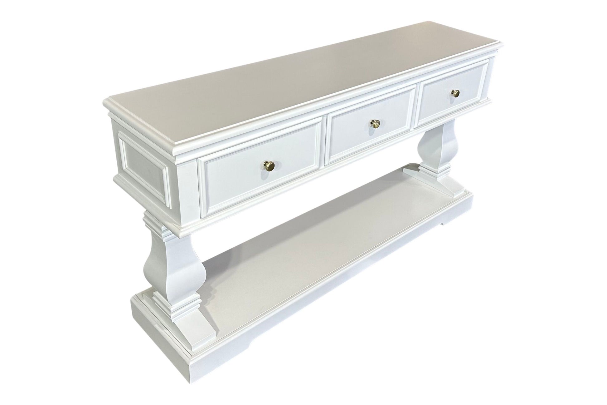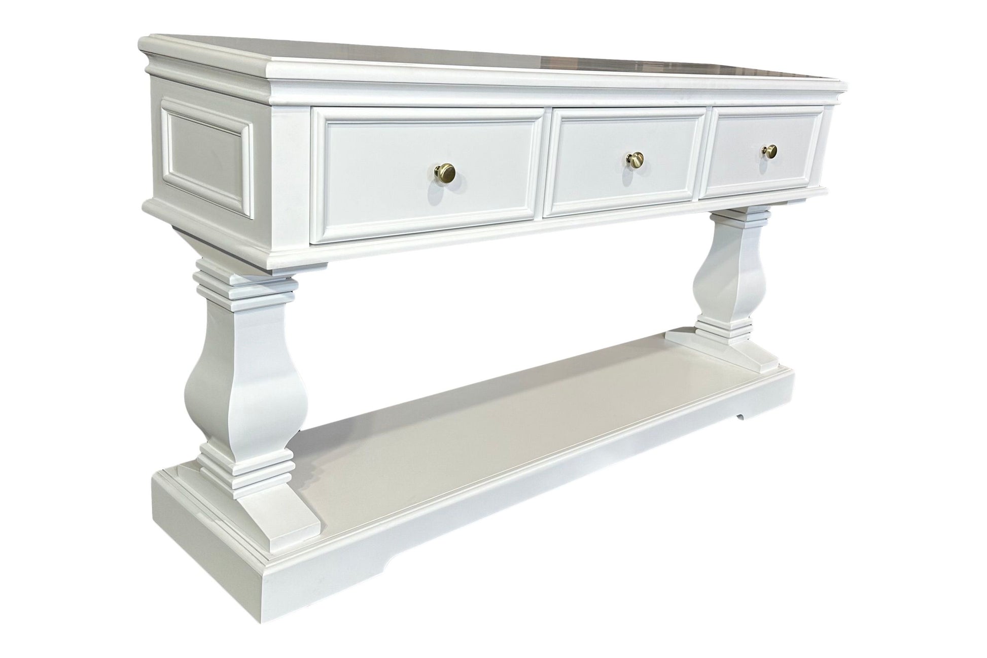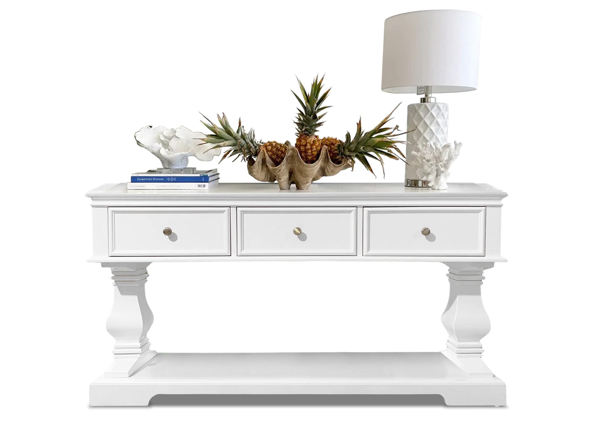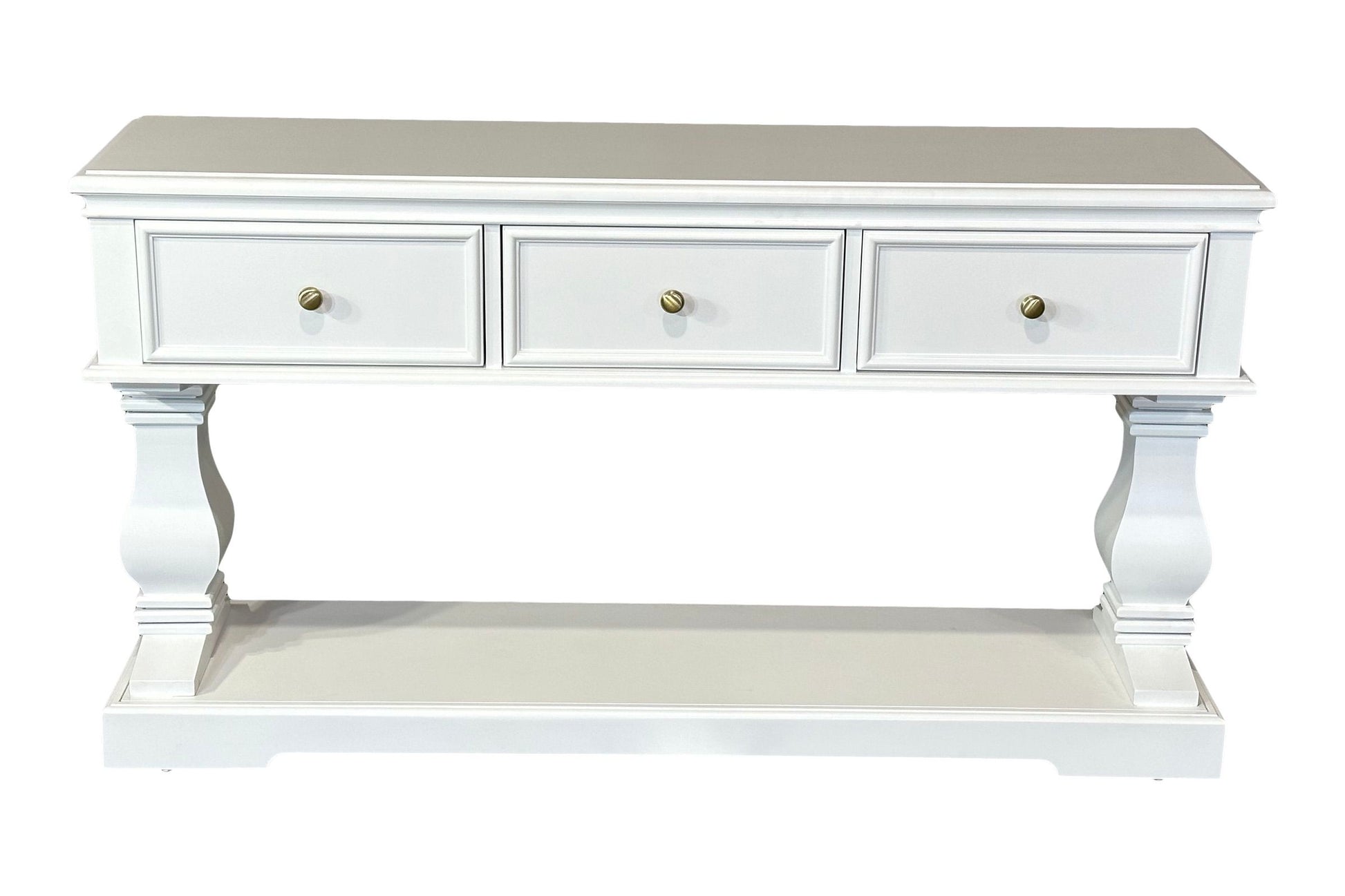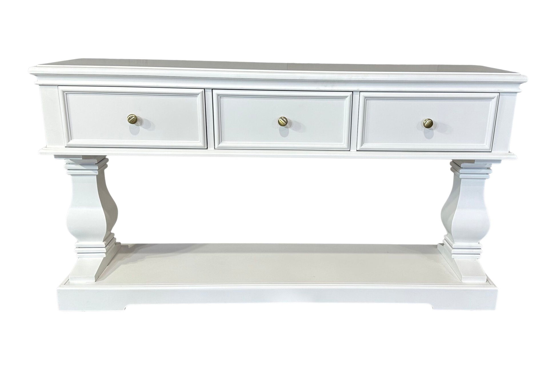 The Haven Console Table is luxury Hamptons at its best. The console table features a stunning all white finish, elegant mouldings and felt lined drawers.