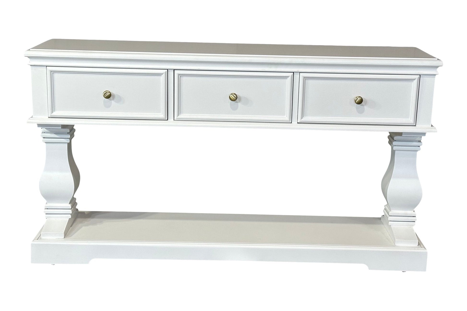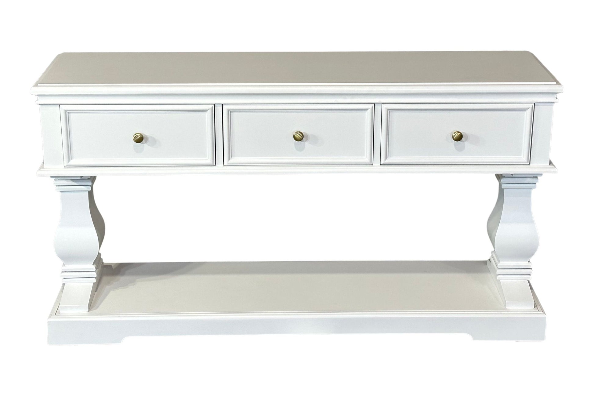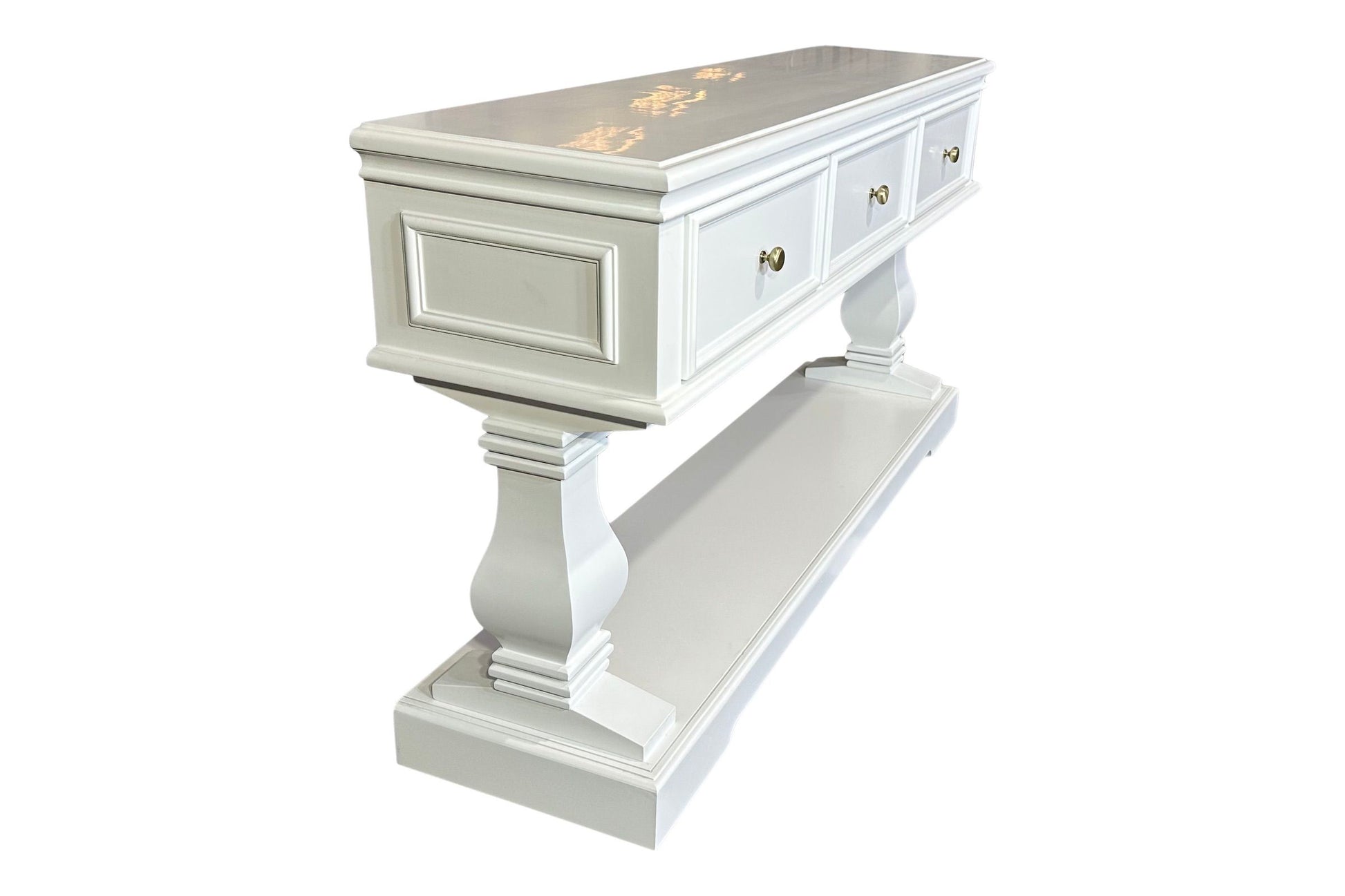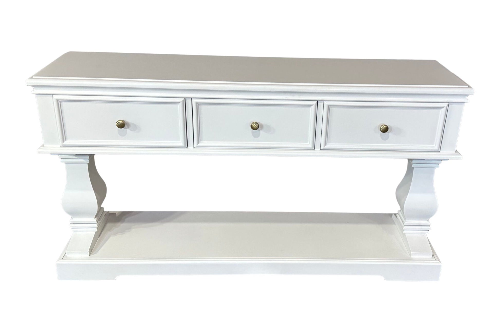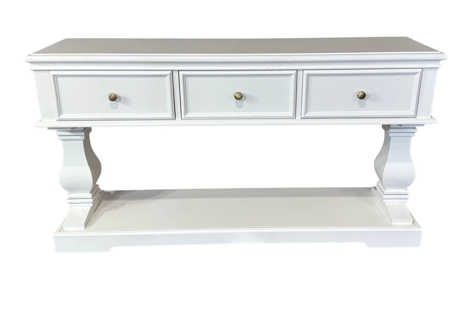 The Haven Console Table is luxury Hamptons at its best. The console table features a stunning all white finish, elegant mouldings and felt lined drawers.