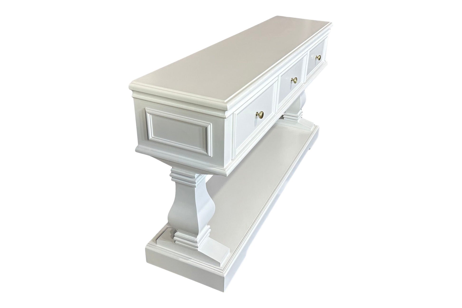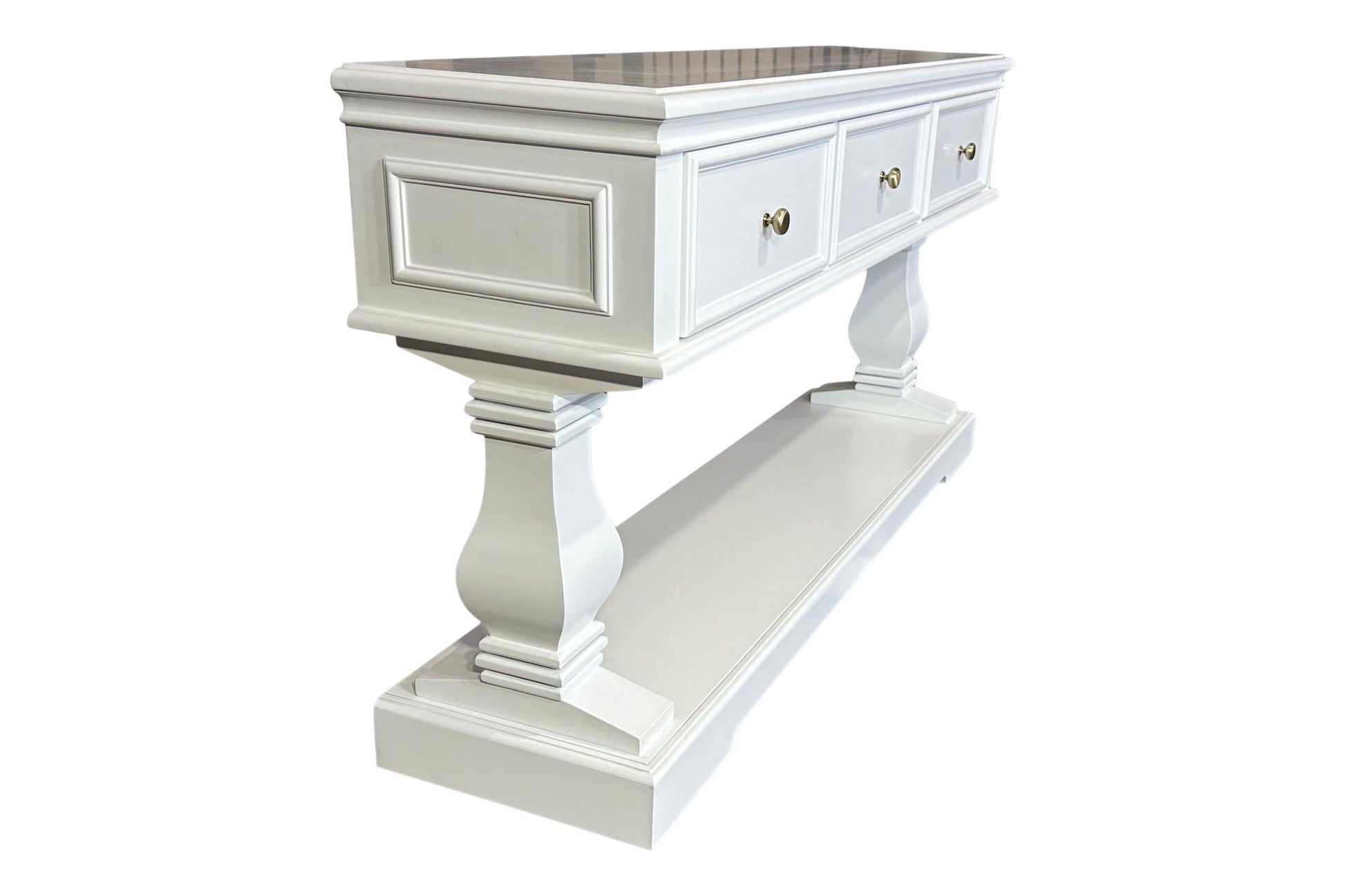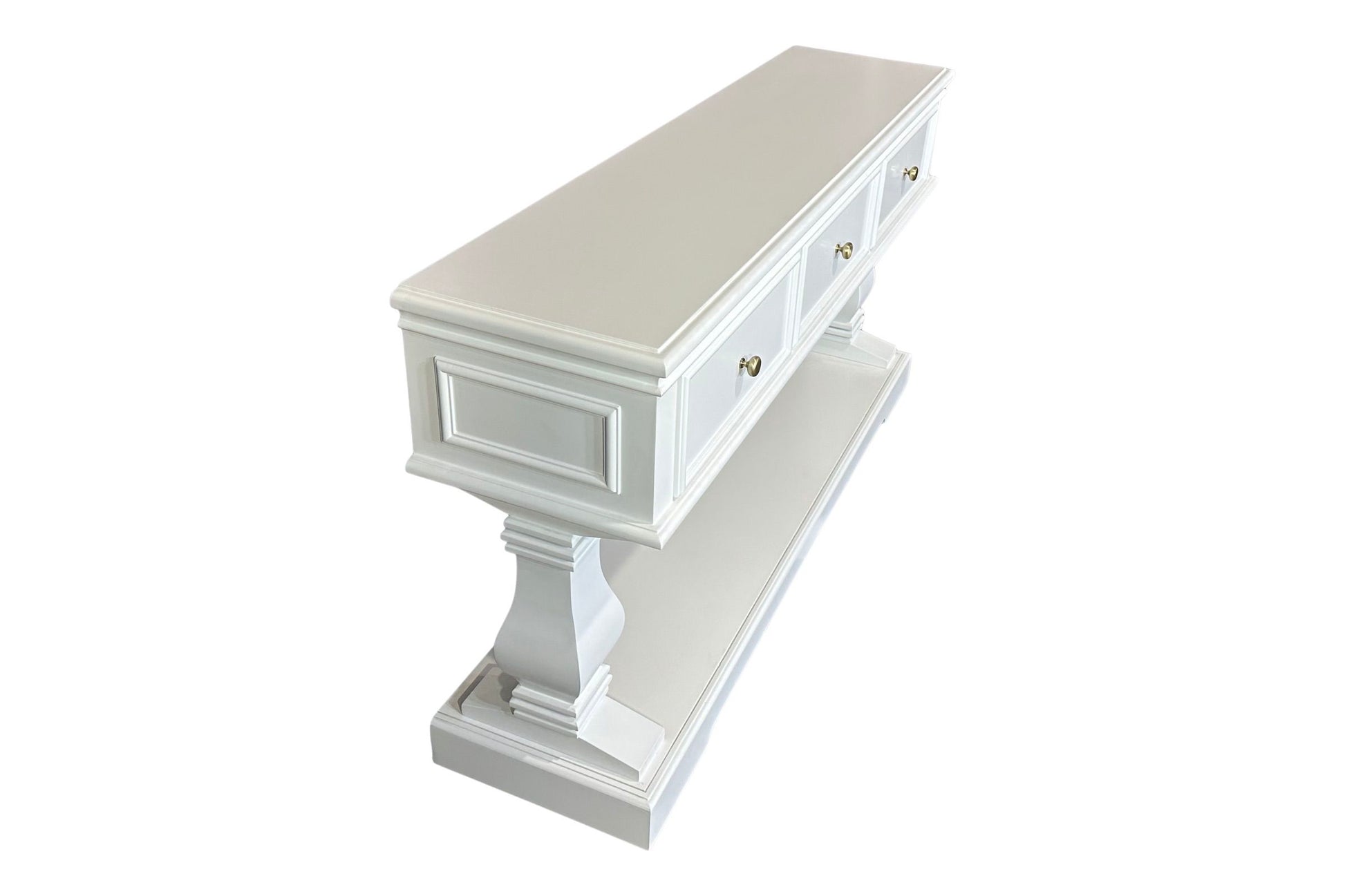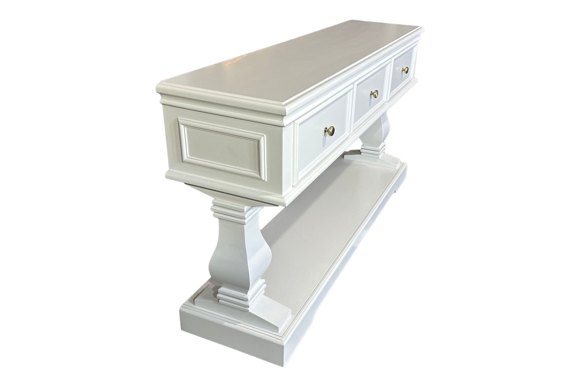 The Haven Console Table is luxury Hamptons at its best. The console table features a stunning all white finish, elegant mouldings and felt lined drawers.