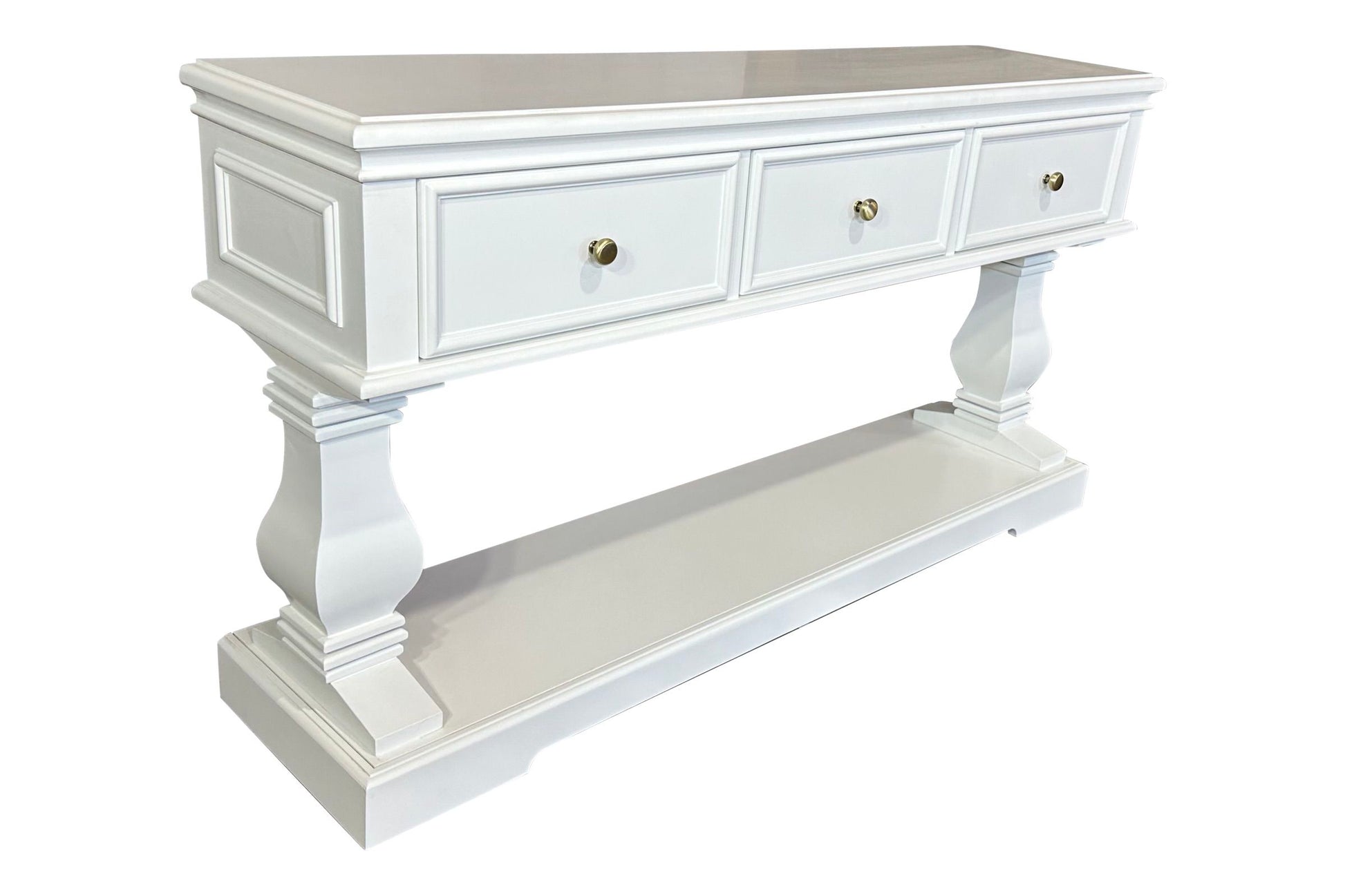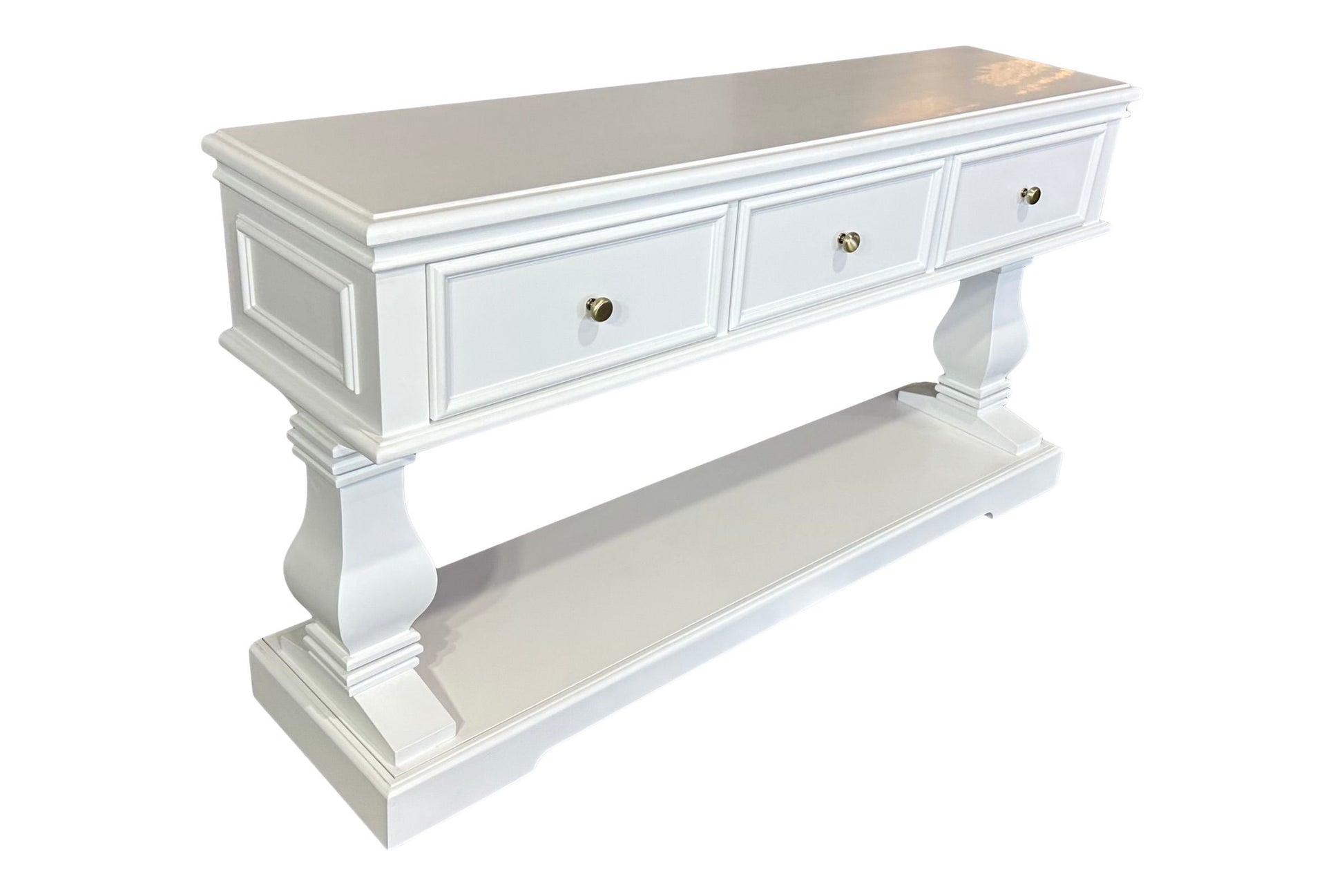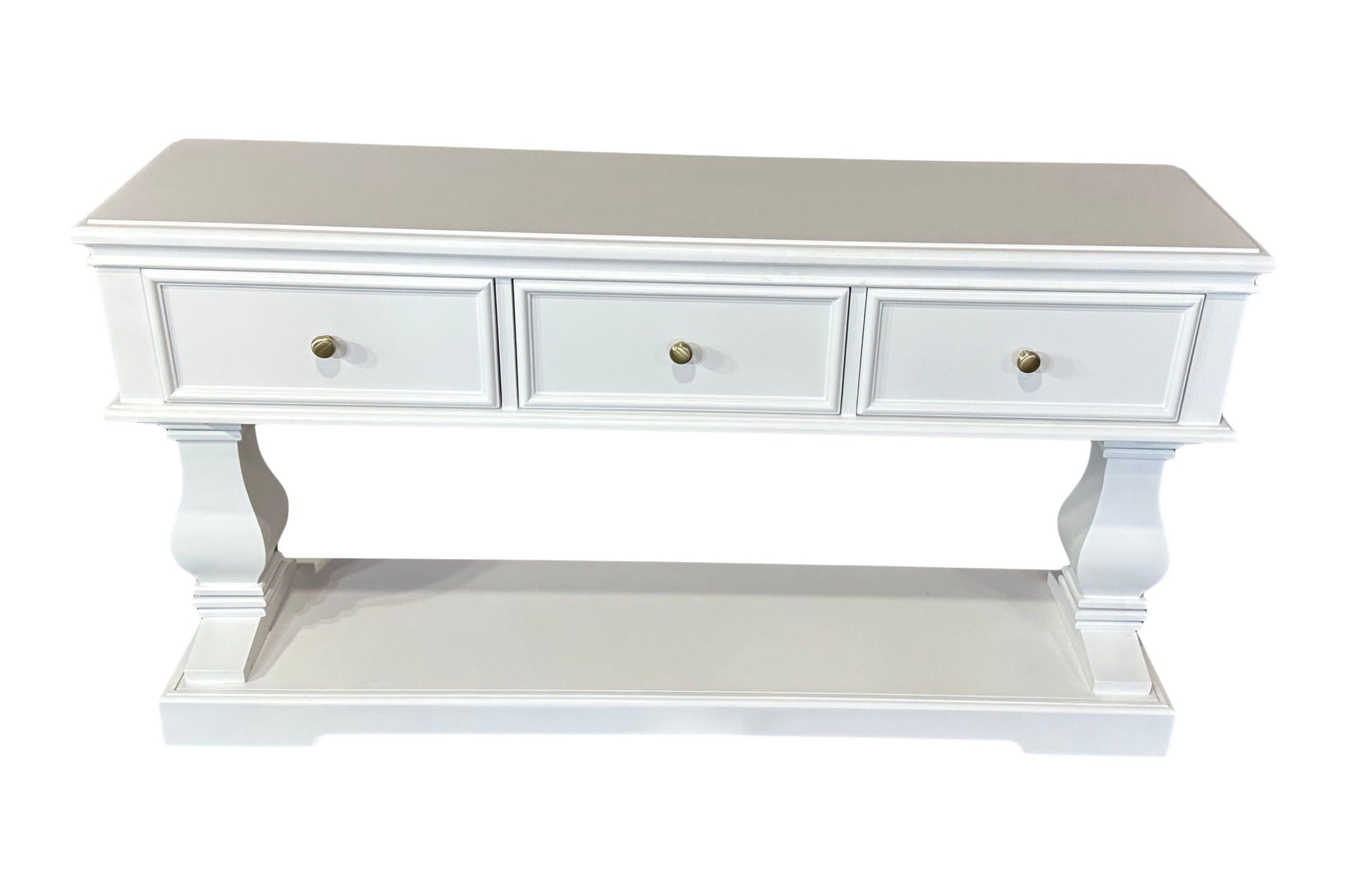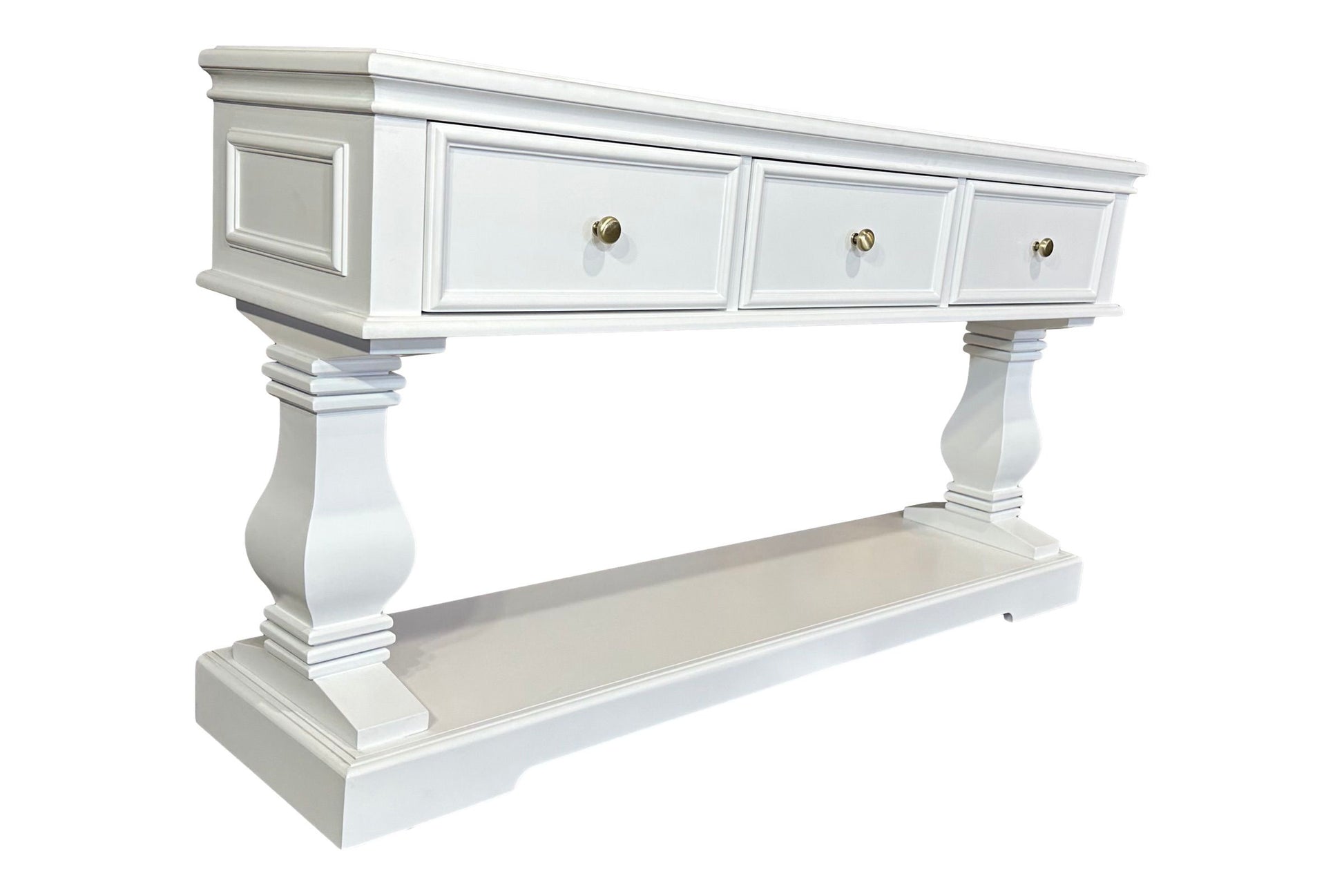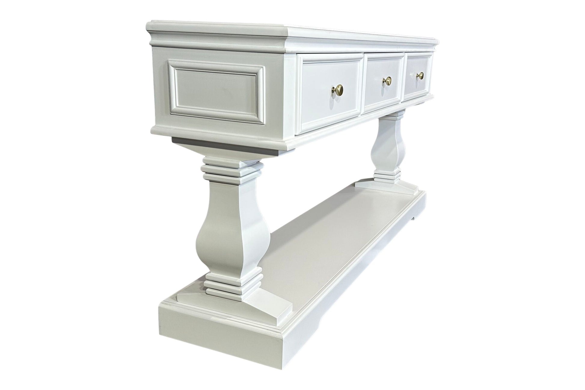 The Haven Console Table is luxury Hamptons at its best. The console table features a stunning all white finish, elegant mouldings and felt lined drawers.