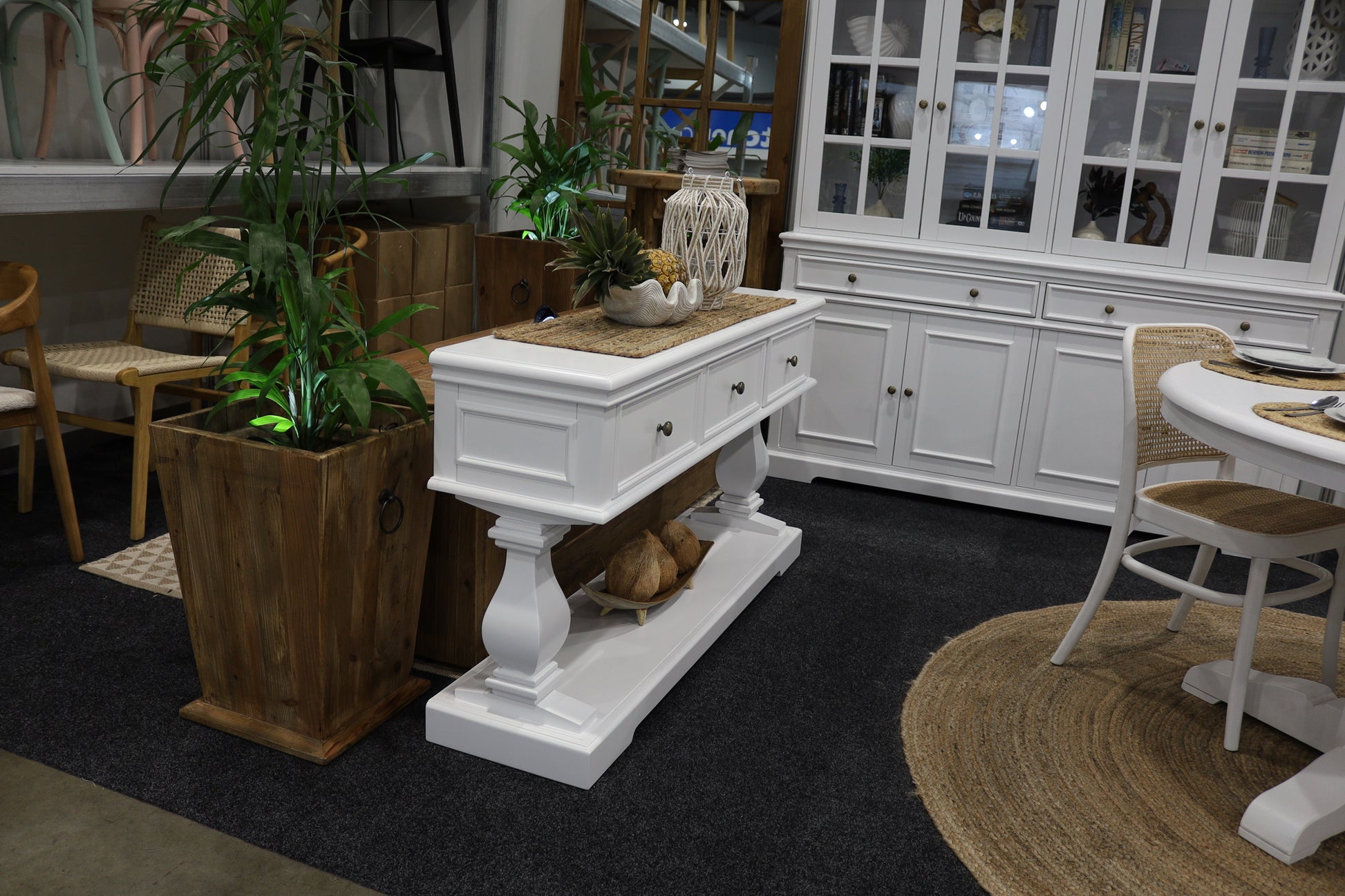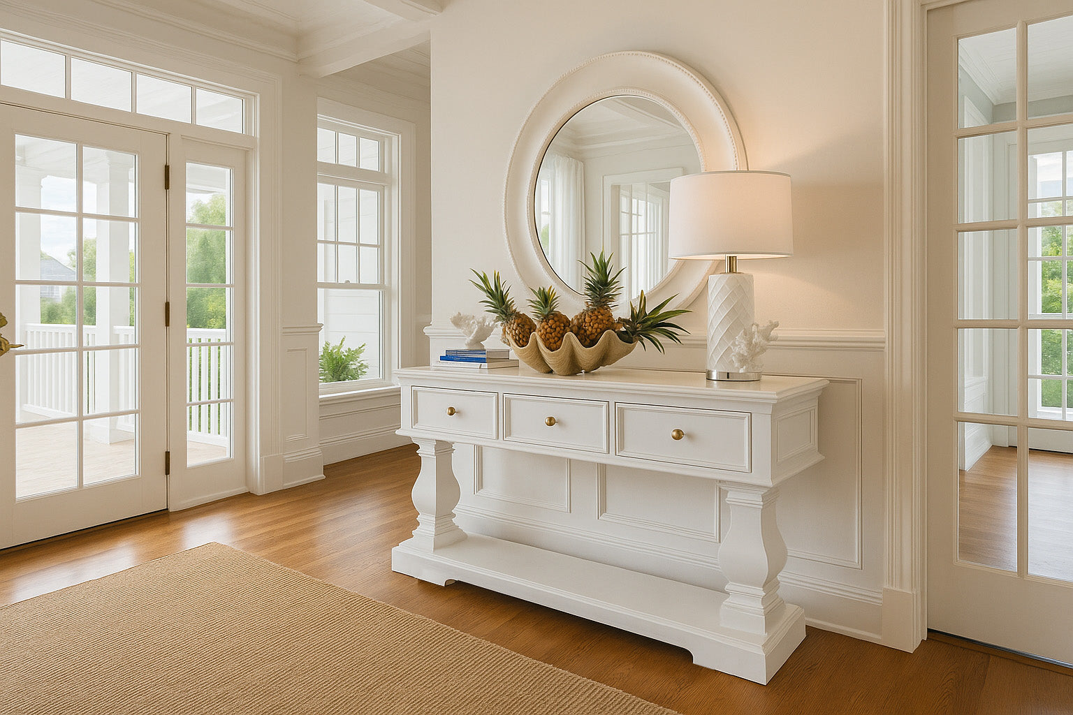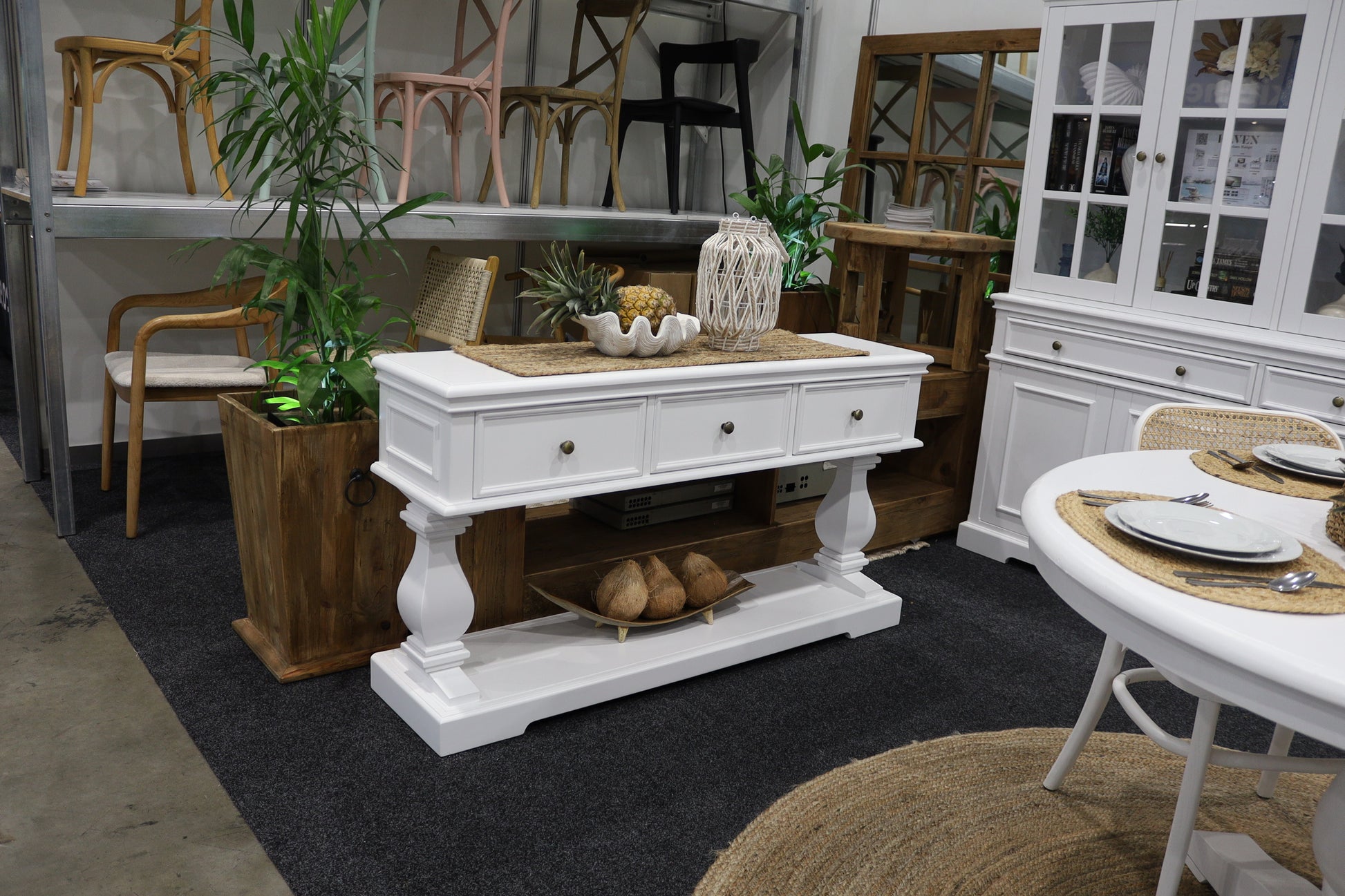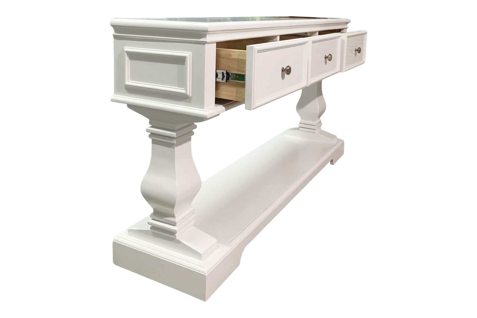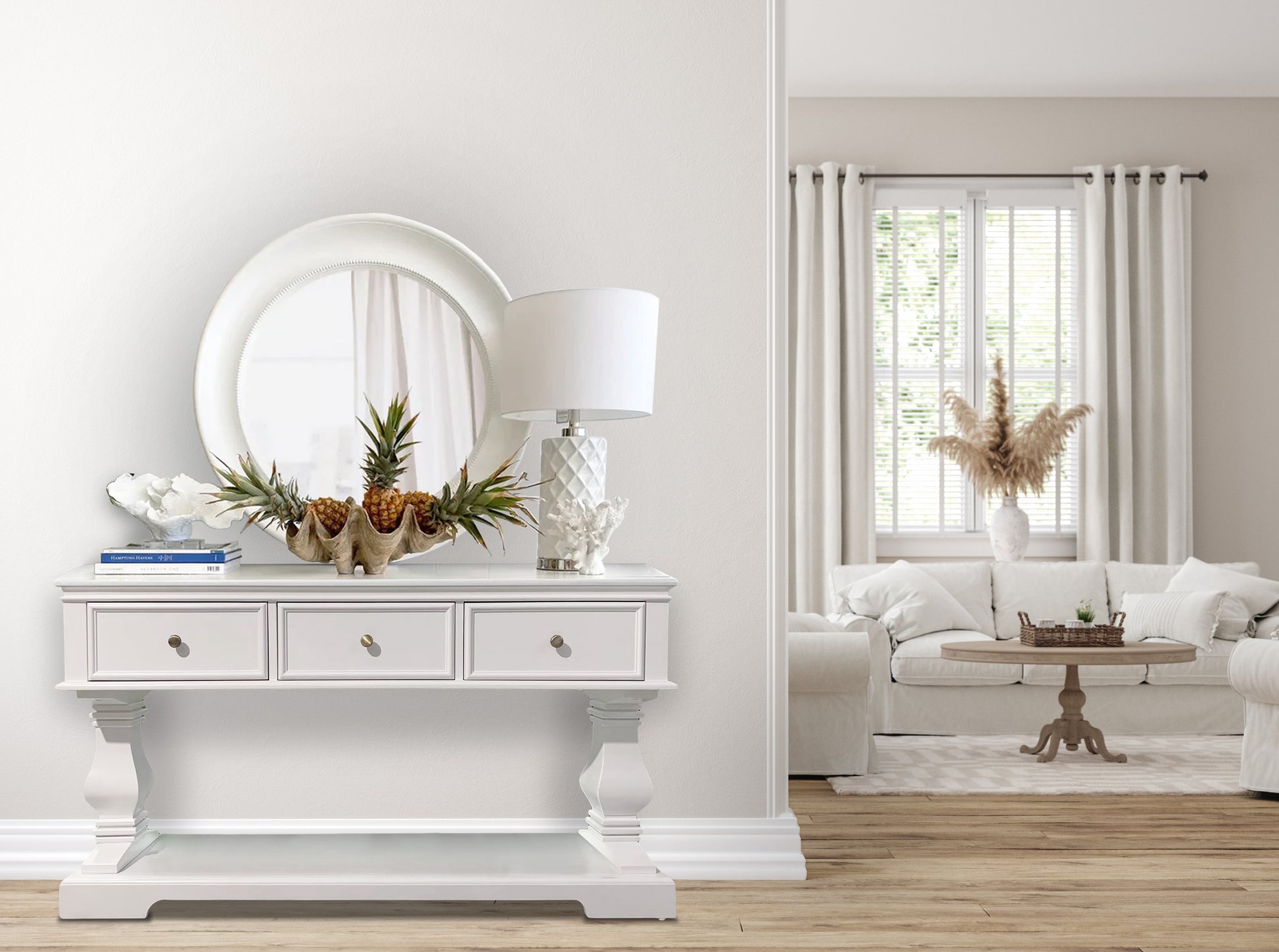 The Haven Console Table is luxury Hamptons at its best. The console table features a stunning all white finish, elegant mouldings and felt lined drawers.