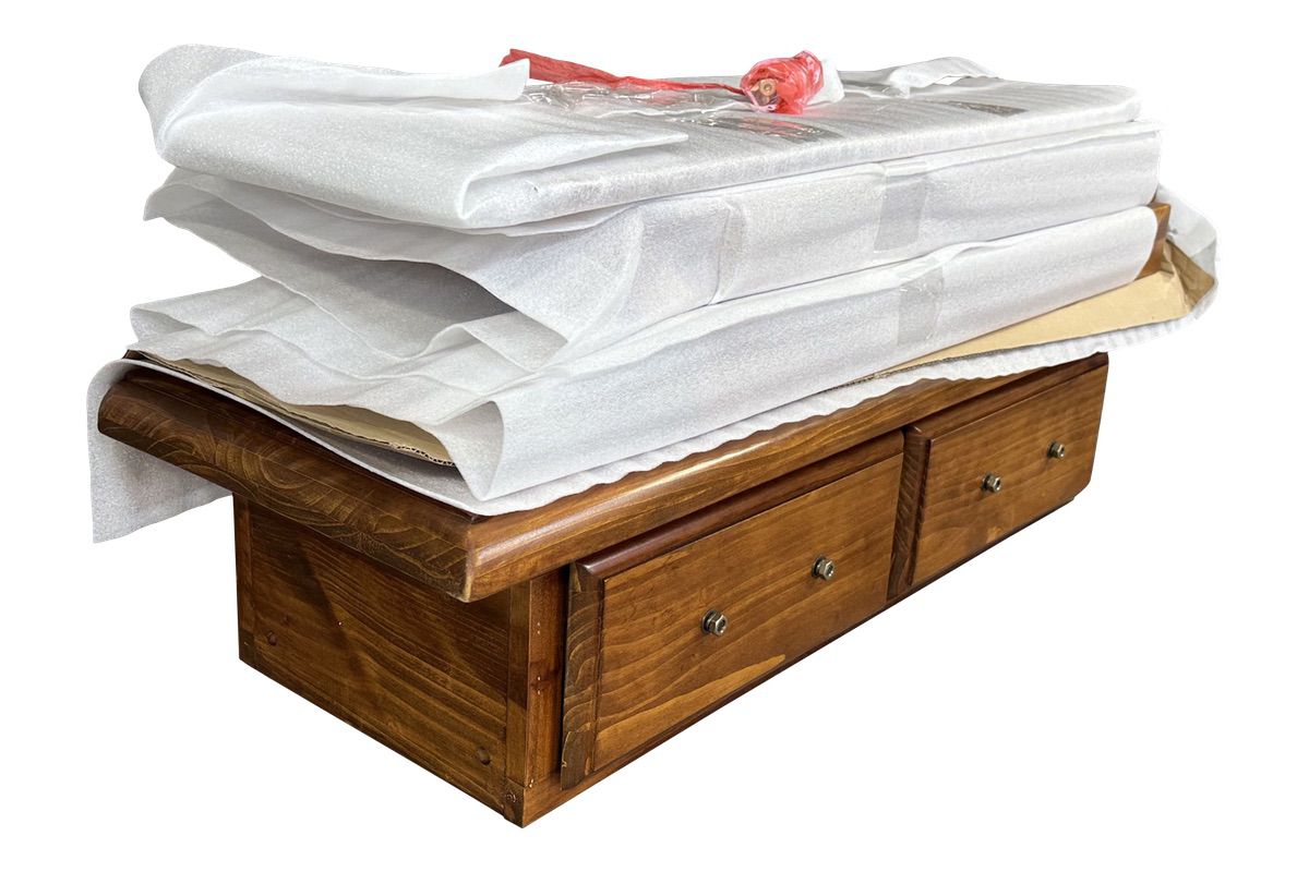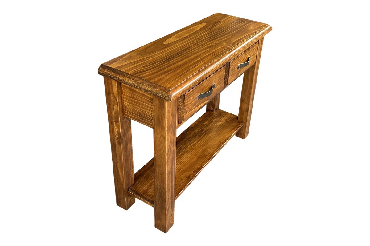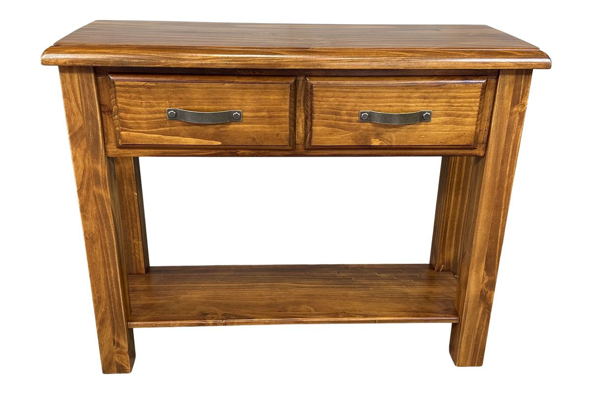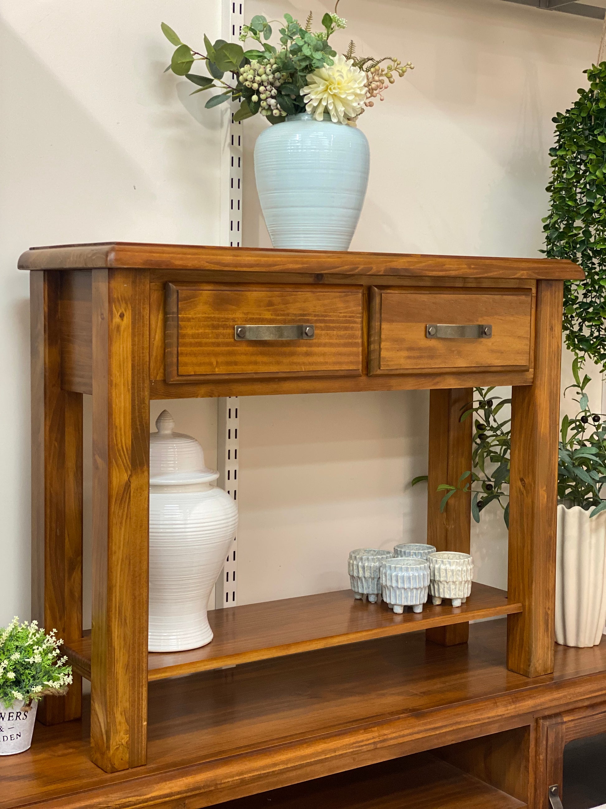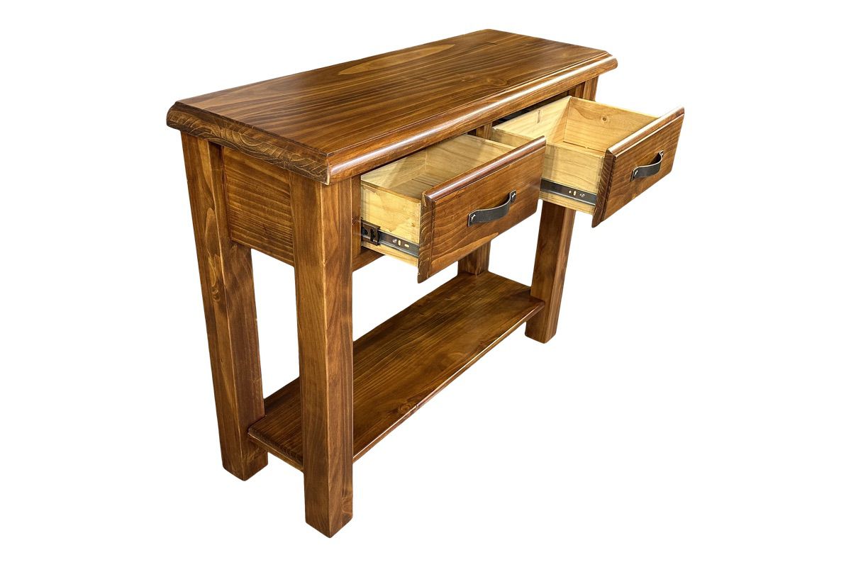 The Hinterland Console Table is a rustic piece. The table has two drawers, a large lower shelf and comes flat packed.