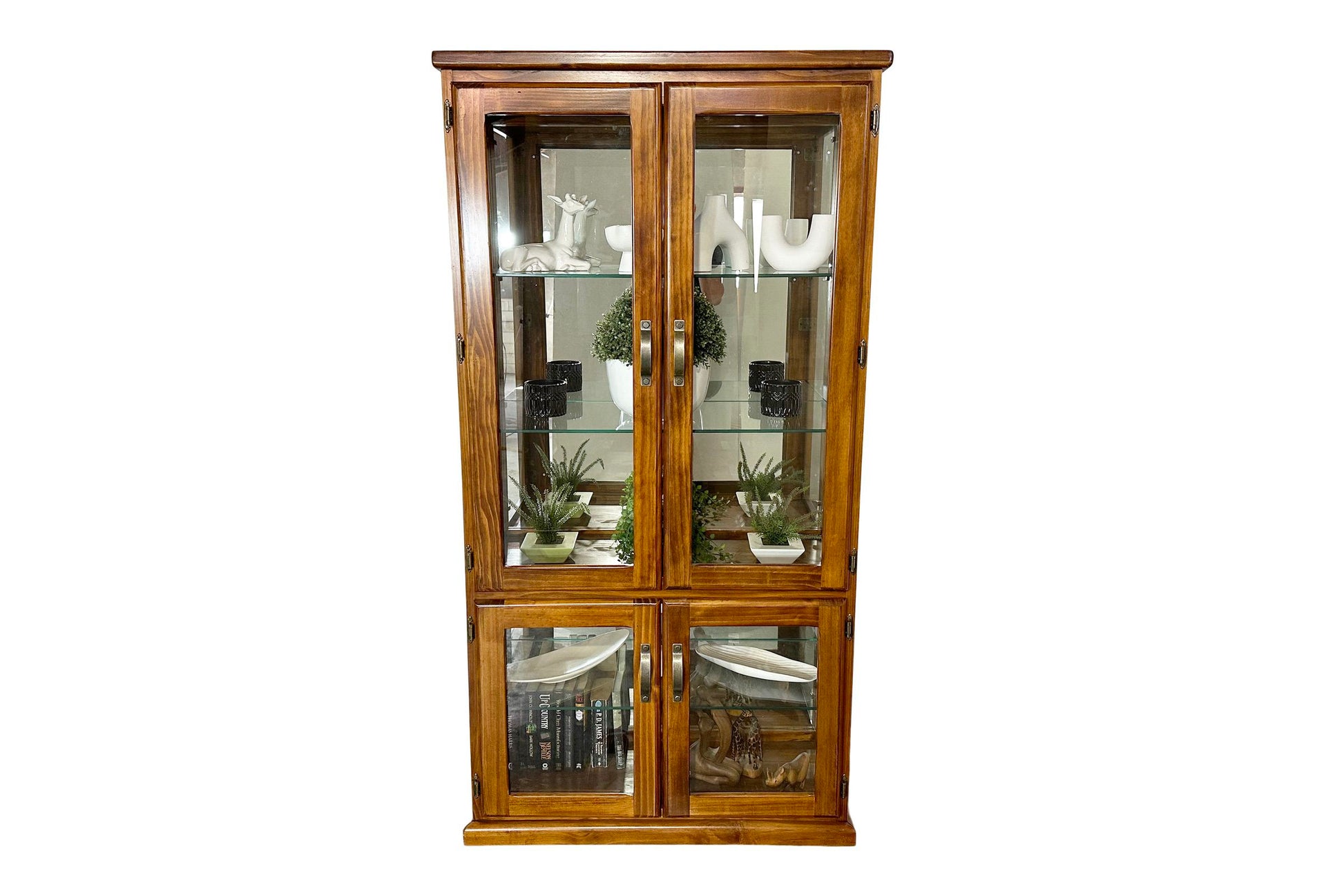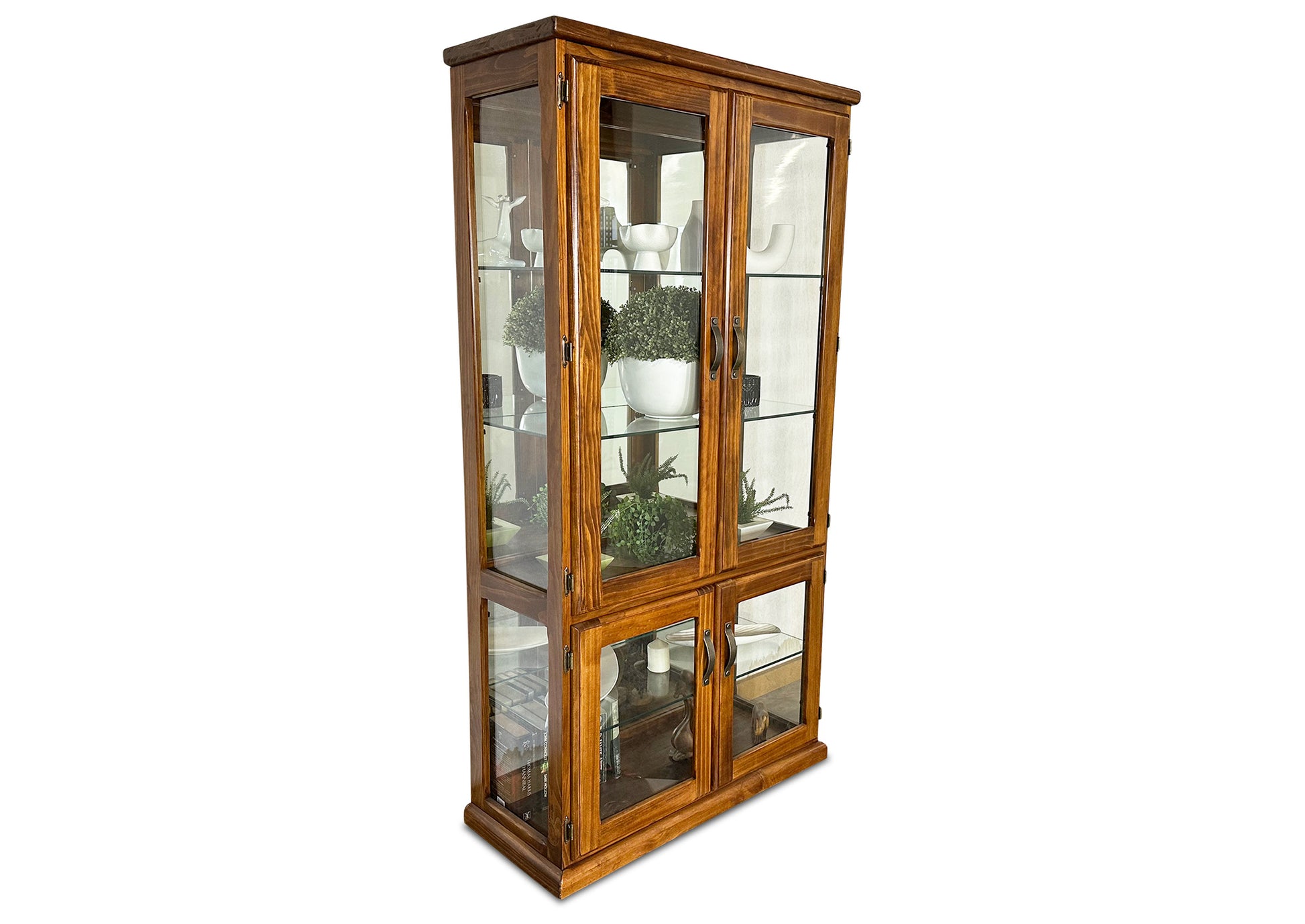 The Hinterland Display Cabinet is a rustic piece. The display cabinet has glass front, glass sides, glass shelves and mirror back.