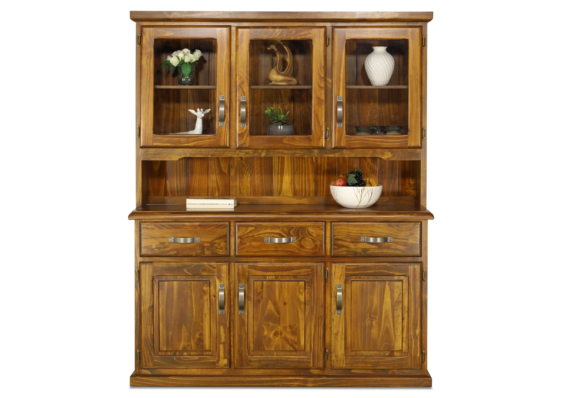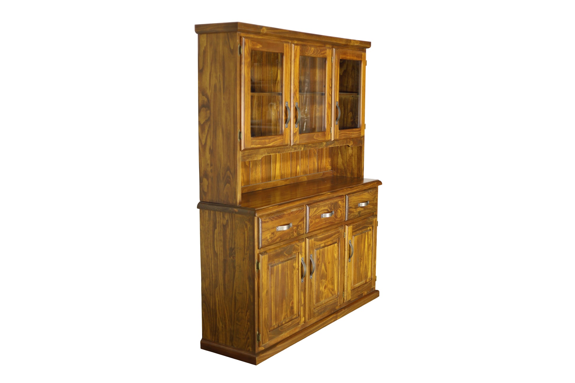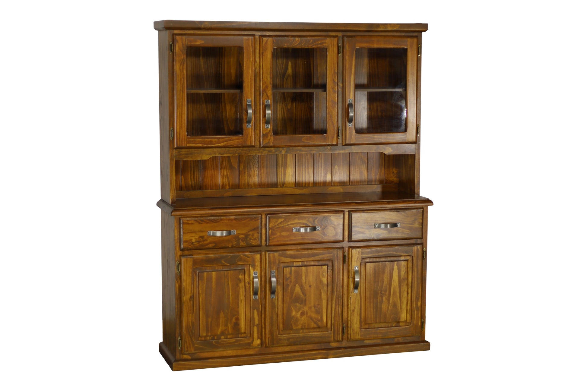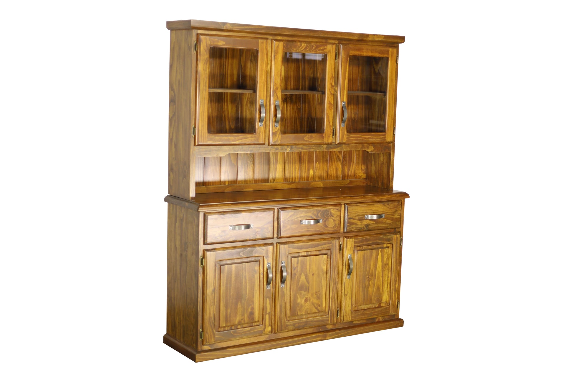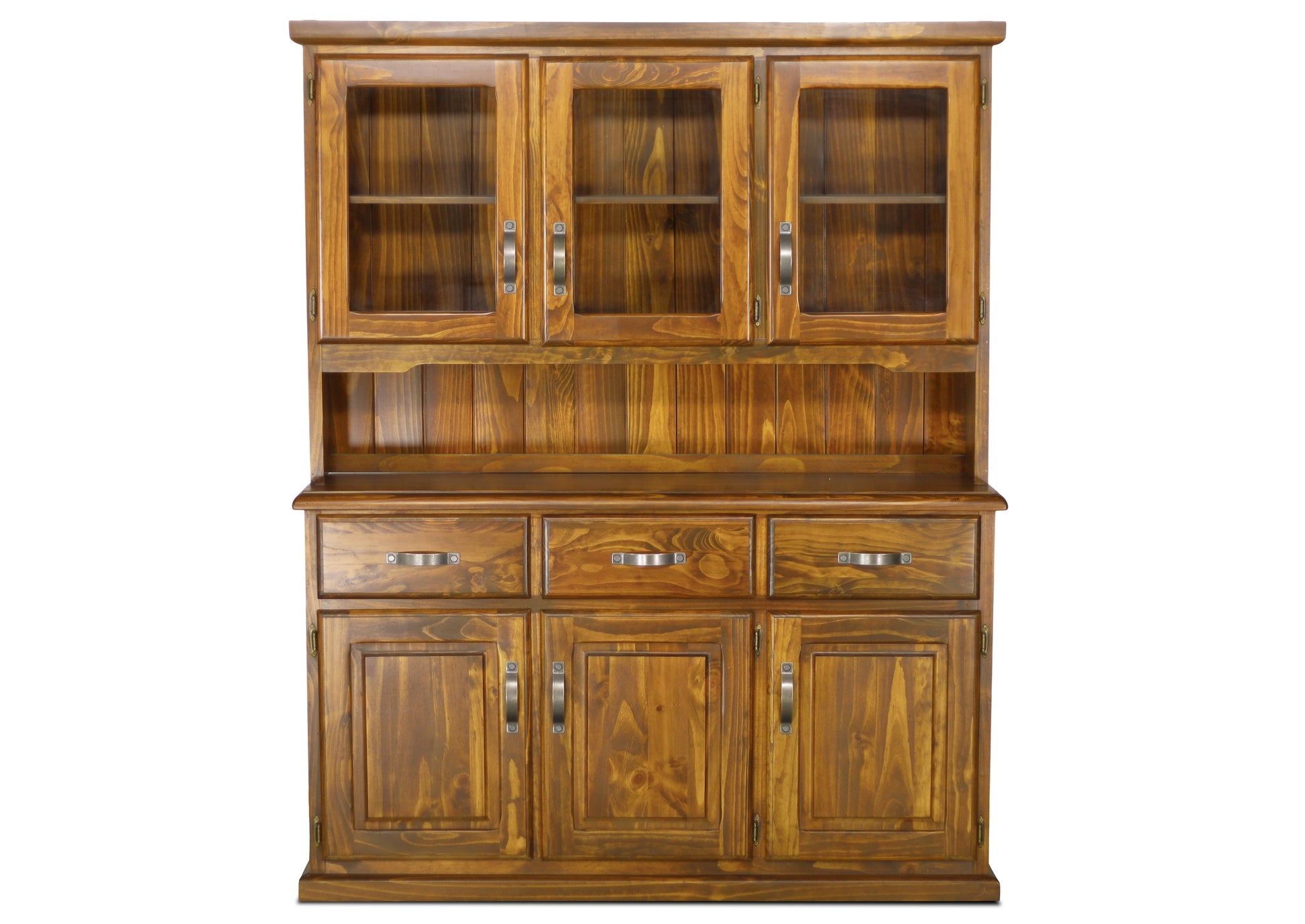 The Hinterland Dresser is a rustic piece. The buffet section features three drawers with metal drawer runners and three doors with a shelf inside. The hutch top features three glass doors and a cutout in the bottom for using the top of the buffet.