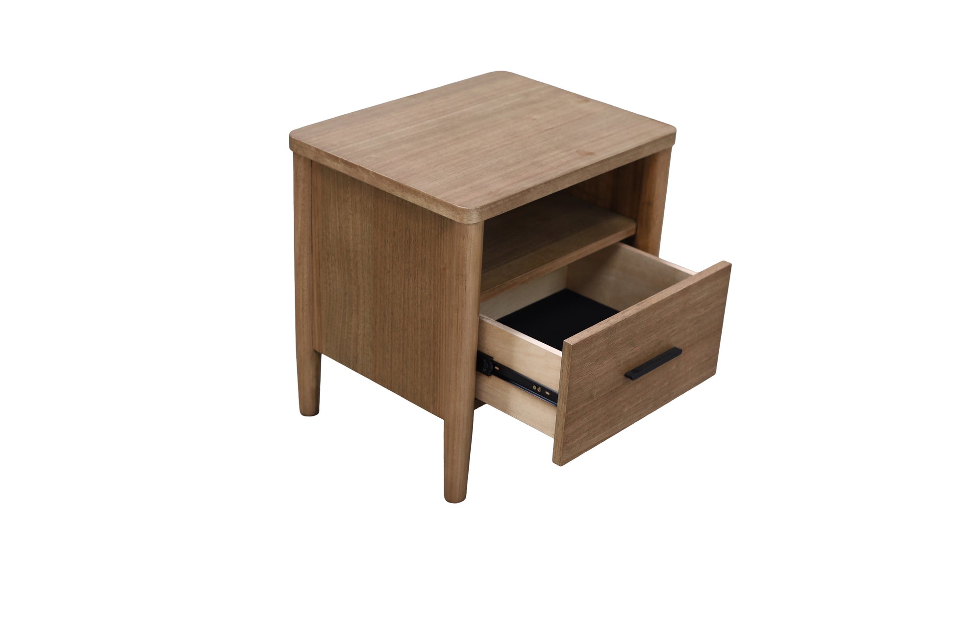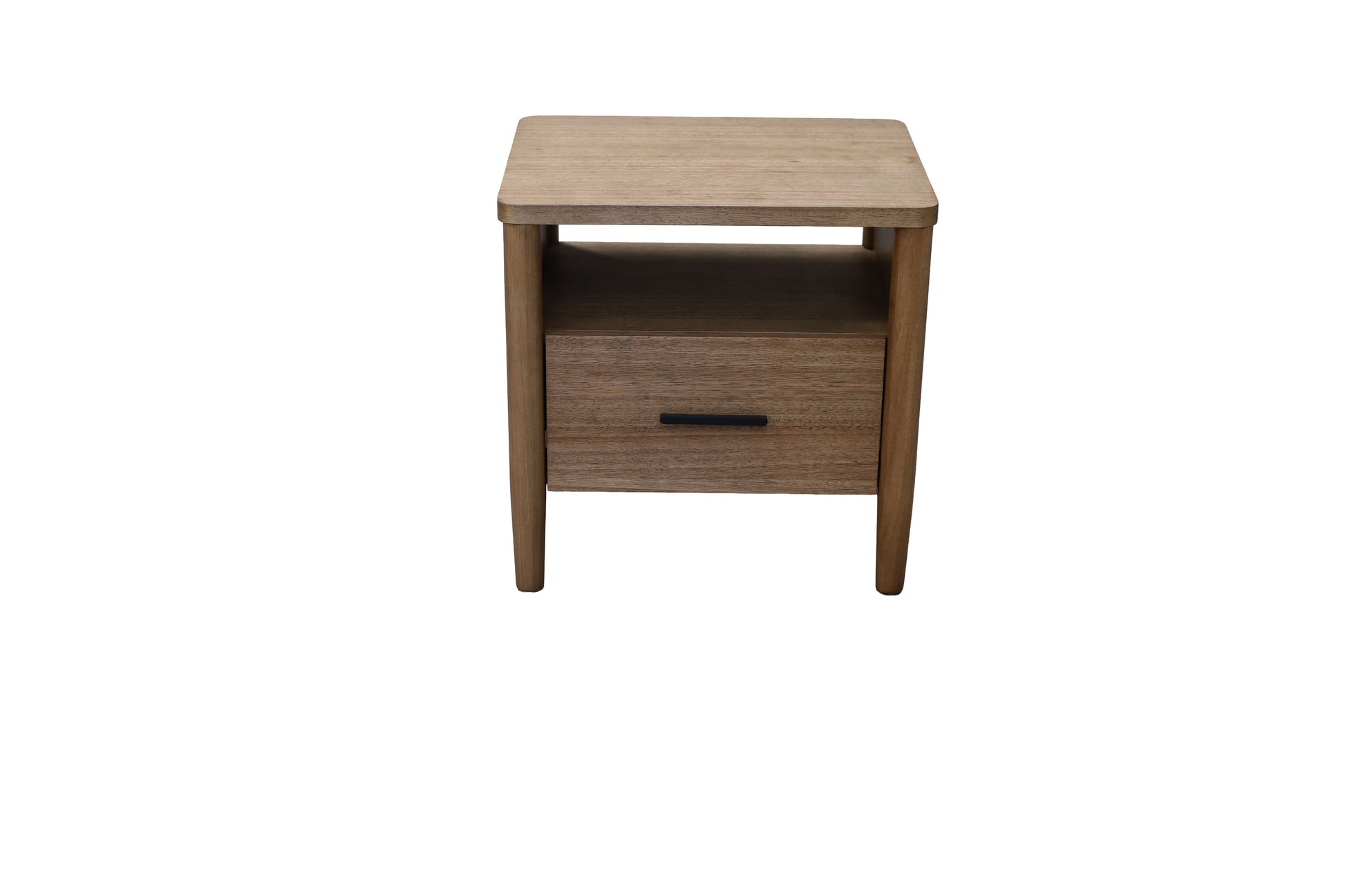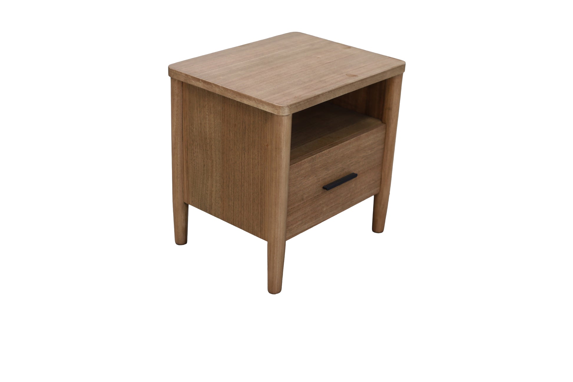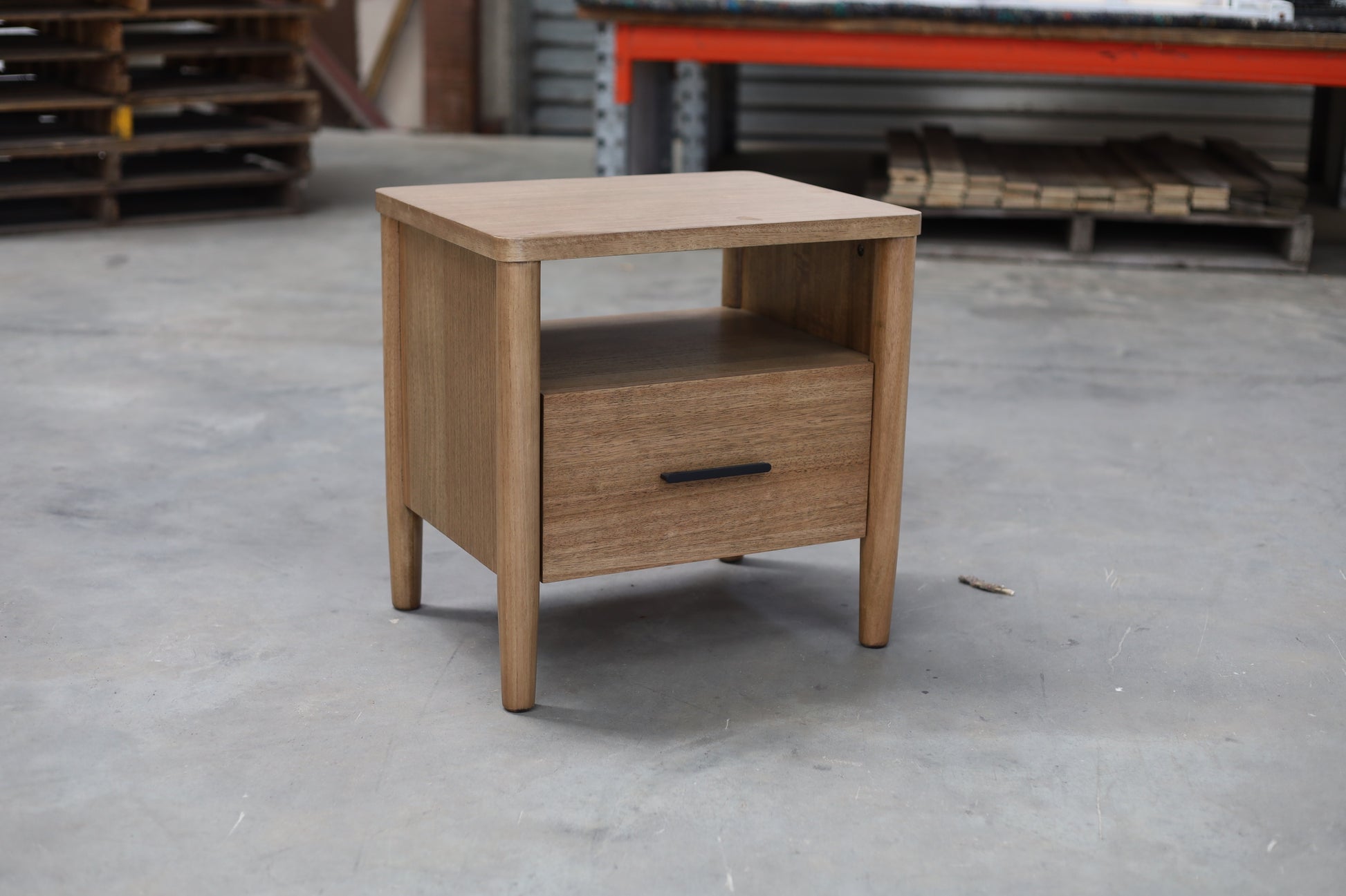 The Hobart Bedside Table features one drawer with metal extension runners. It is made from Messmate hardwood finished in a Walnut colour.