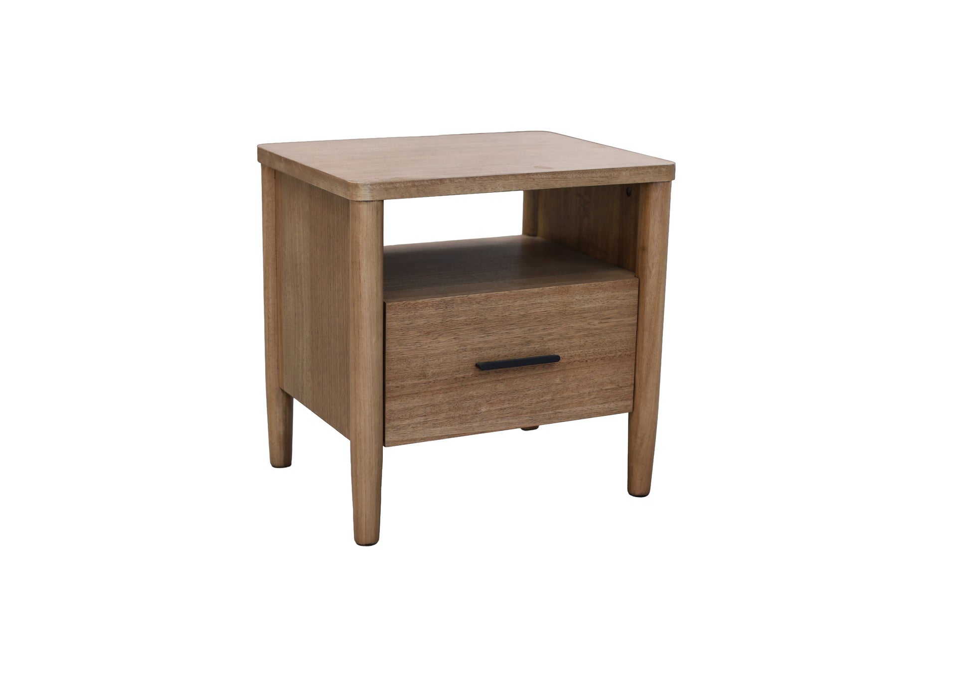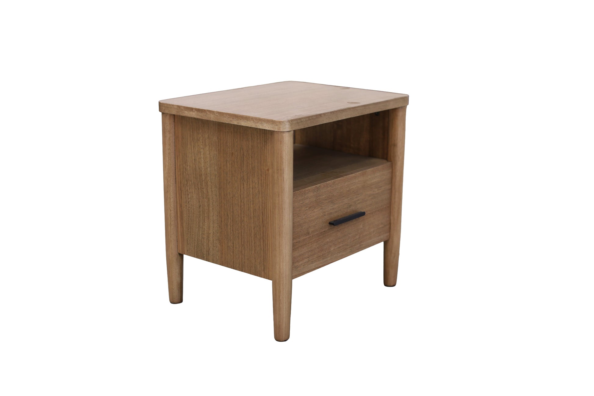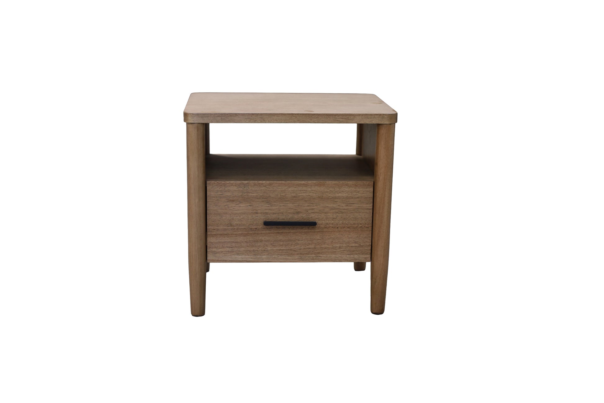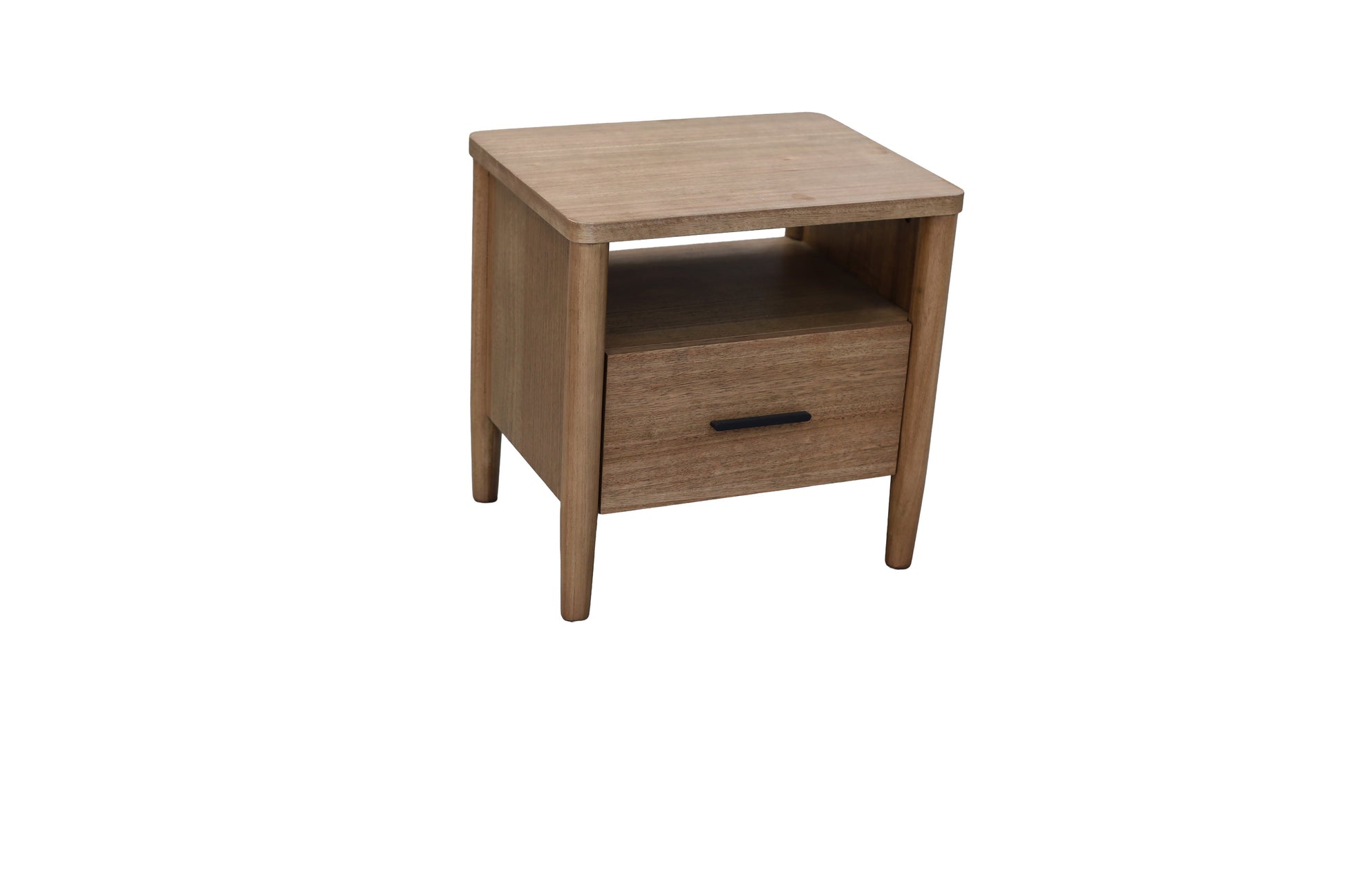 The Hobart Bedside Table features one drawer with metal extension runners. It is made from Messmate hardwood finished in a Walnut colour.