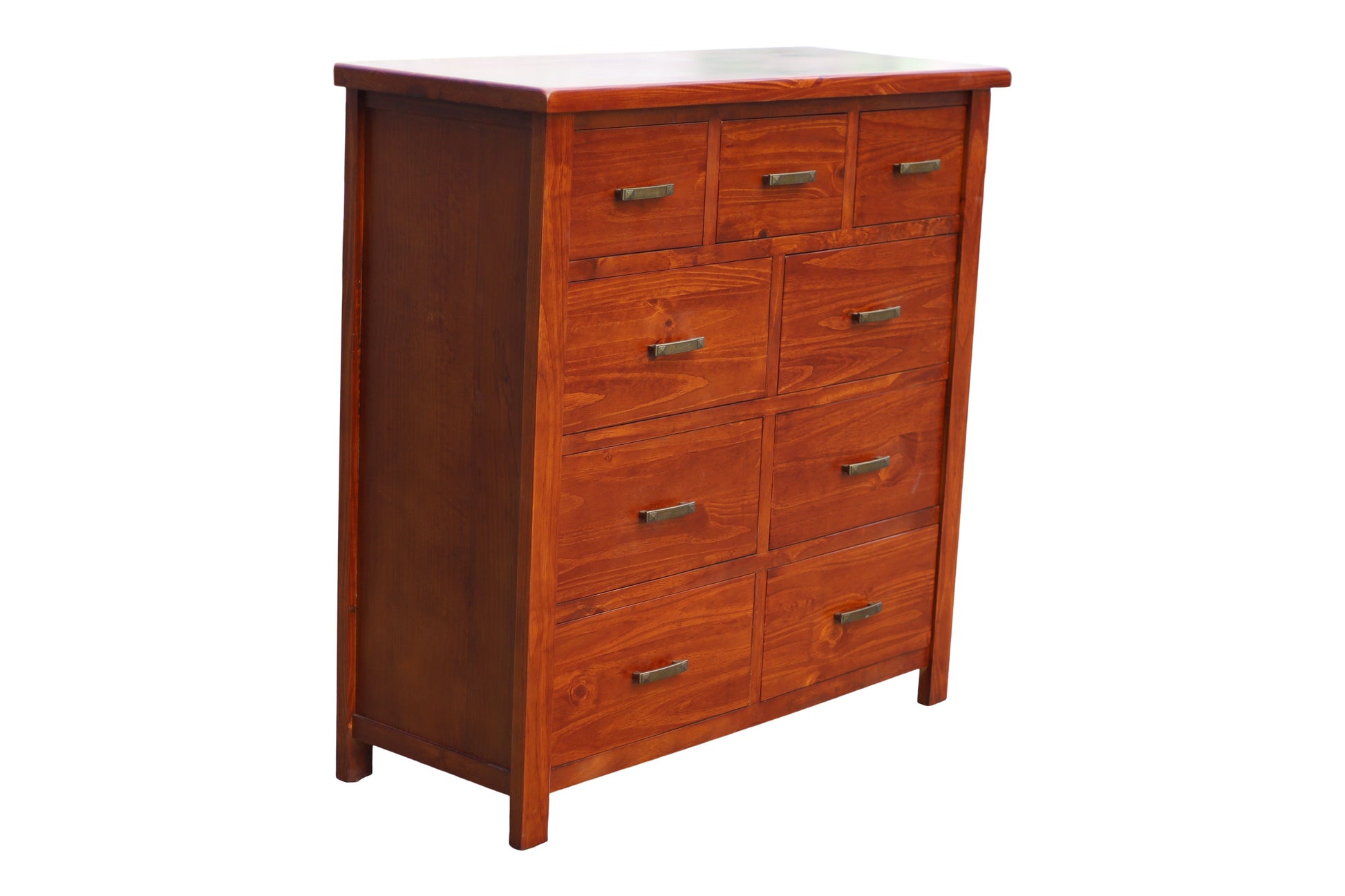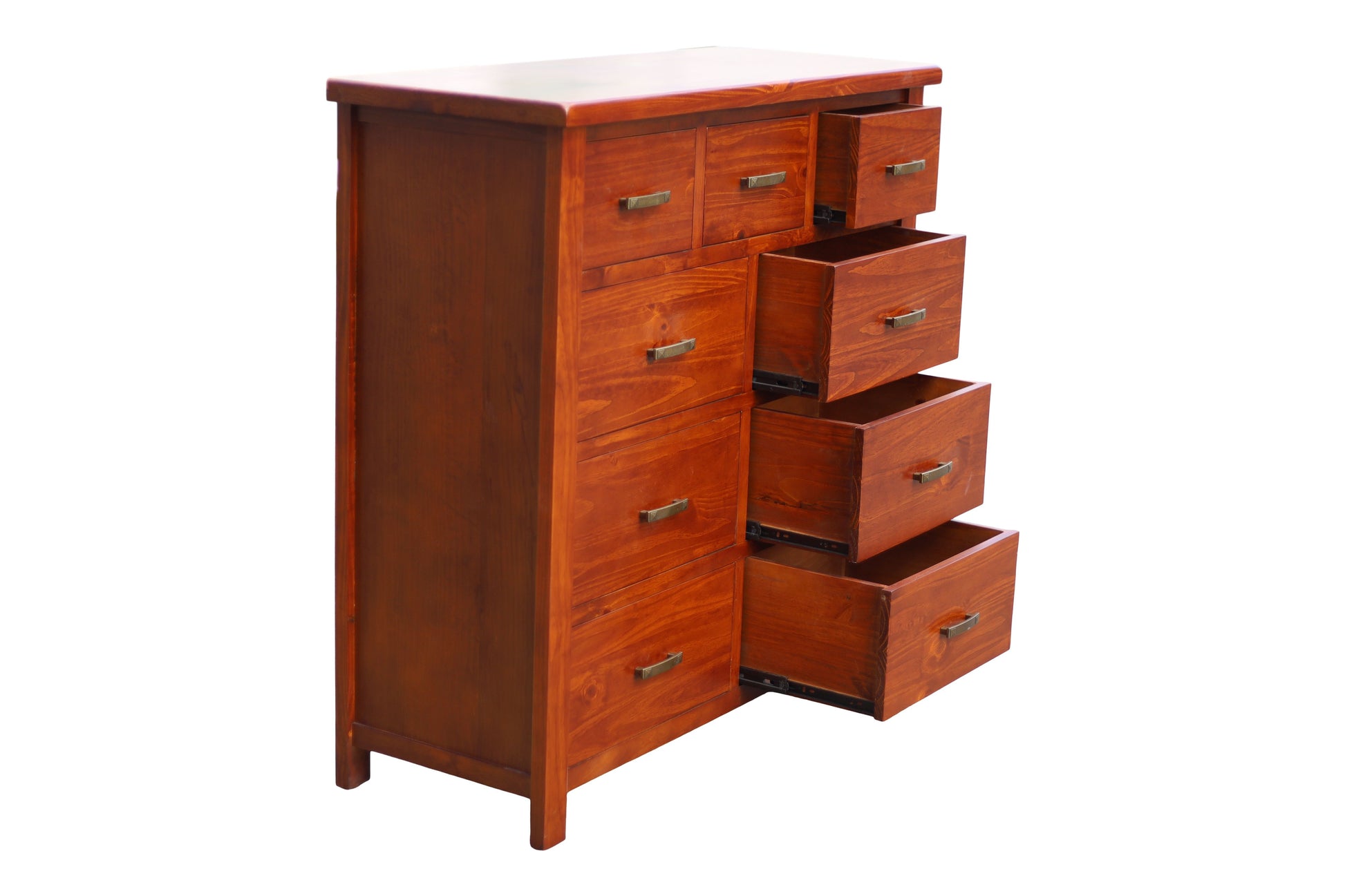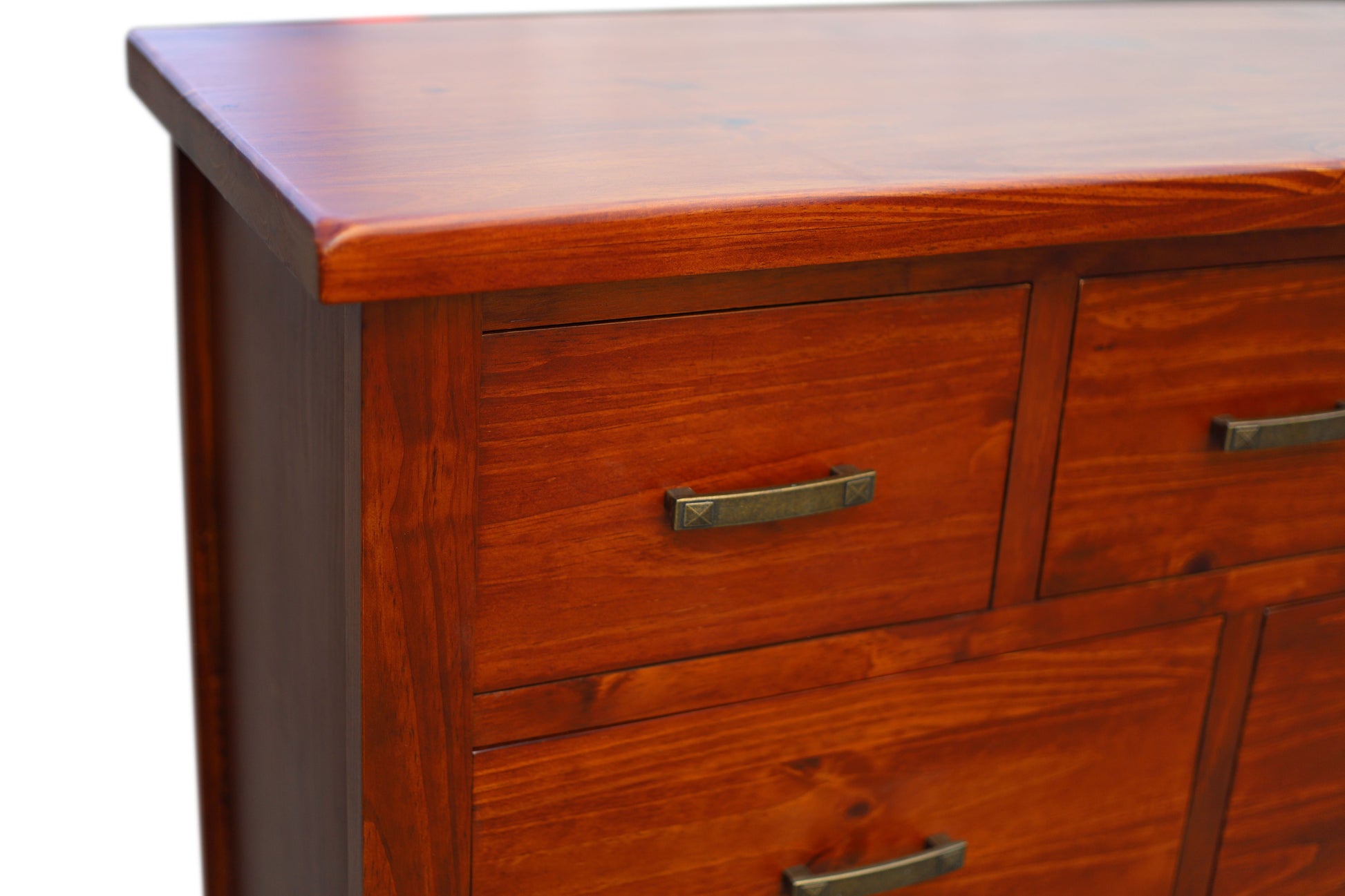 The Manor Range is a timeless collection of solid wood furniture, crafted to bring warmth and character to any living space. Finished in a rich “nutmeg” colour, the deep, earthy tones accentuate the natural grain of the wood. The tallboy has metal drawer runners.