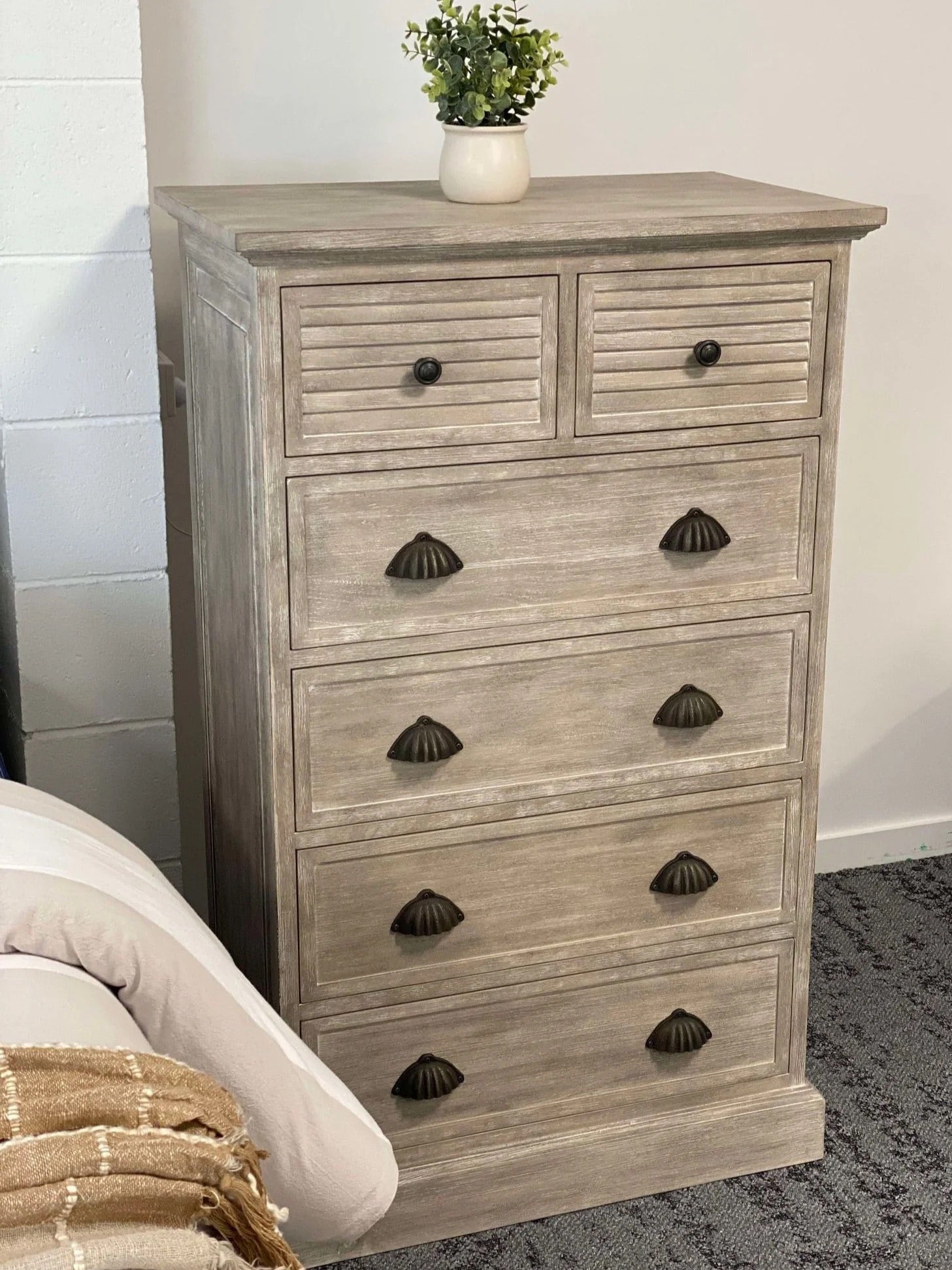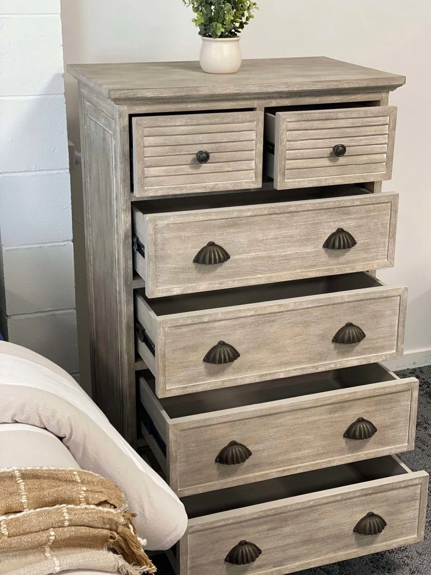 Marella brings the calming hush of the shoreline into your bedroom. Each piece is hand-finished in driftwood tones, with sculpted seashell hardware that echoes treasures found on morning beach walks. Crafted from solid timber for lasting coastal charm.