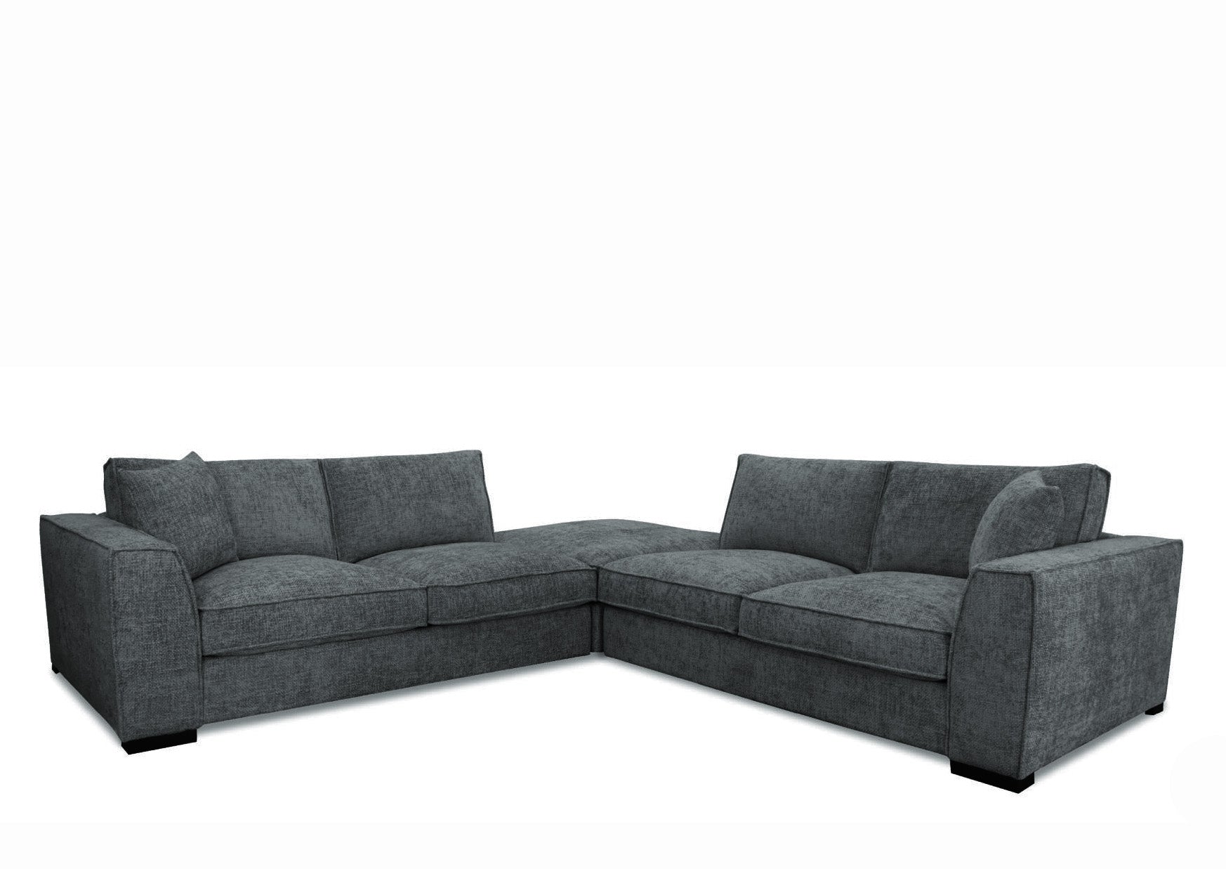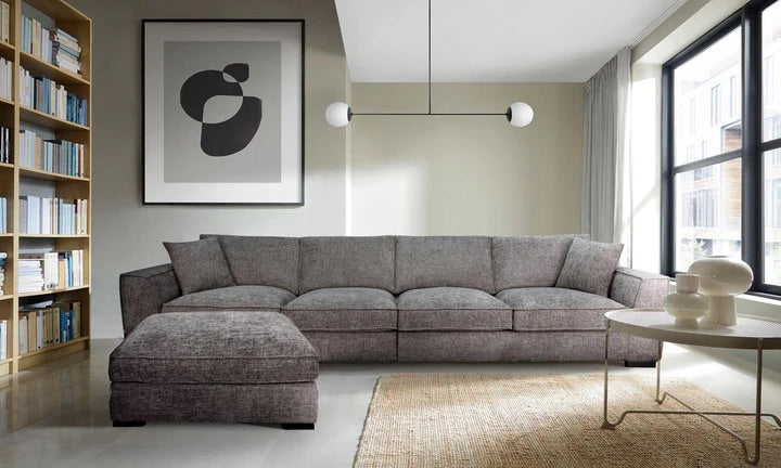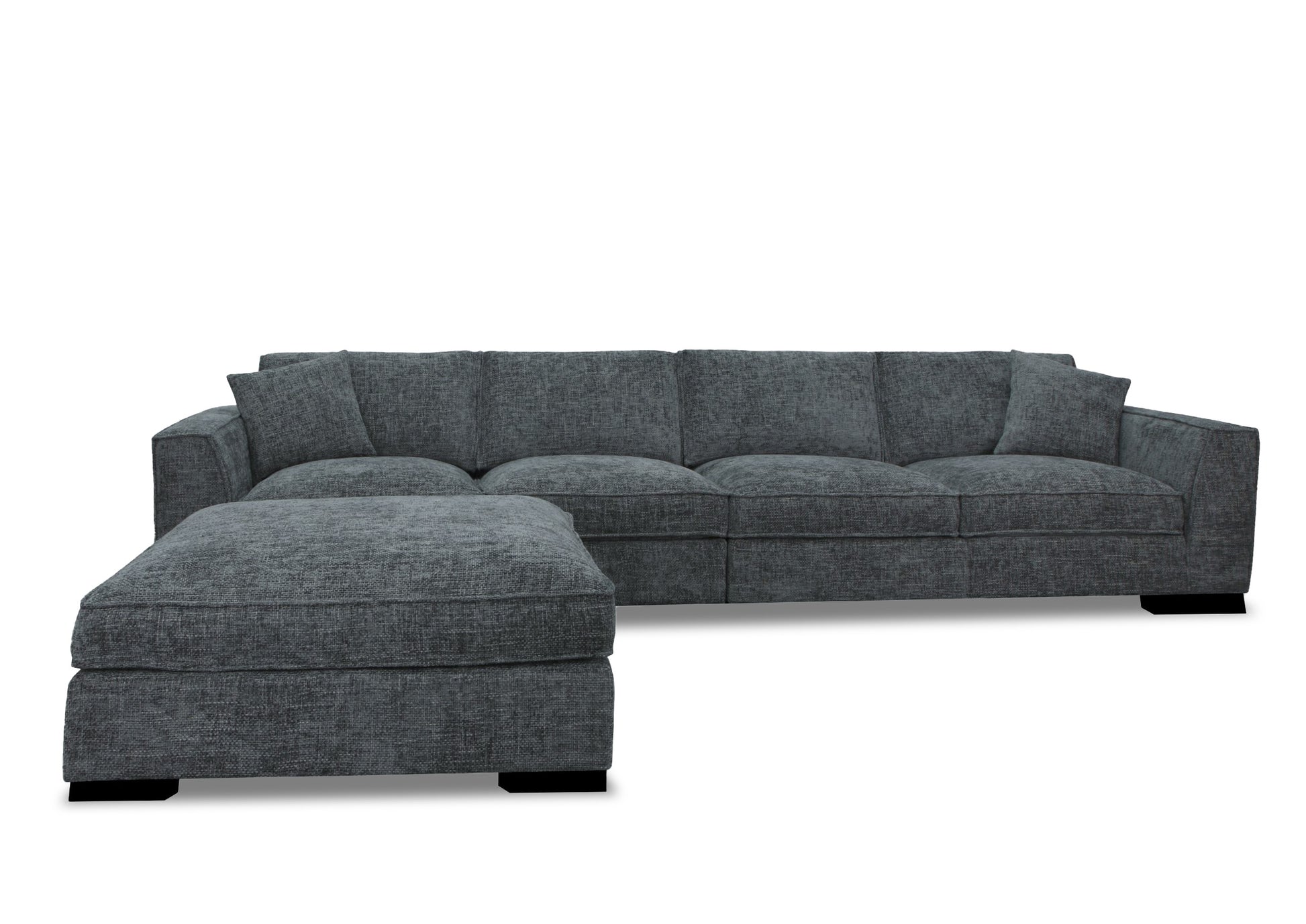 The Matrix Modular Sofas is made up of a left two-seat section, a right two-seat section and an ottoman. Super comfortable feather, fibre & foam filling. It is upholstered in Mornington fabric.