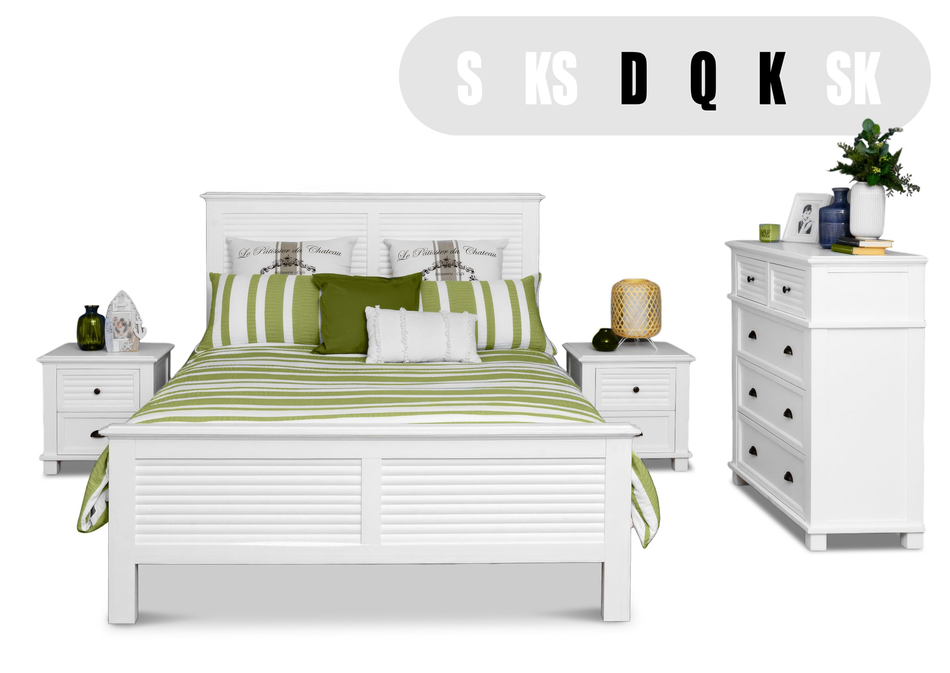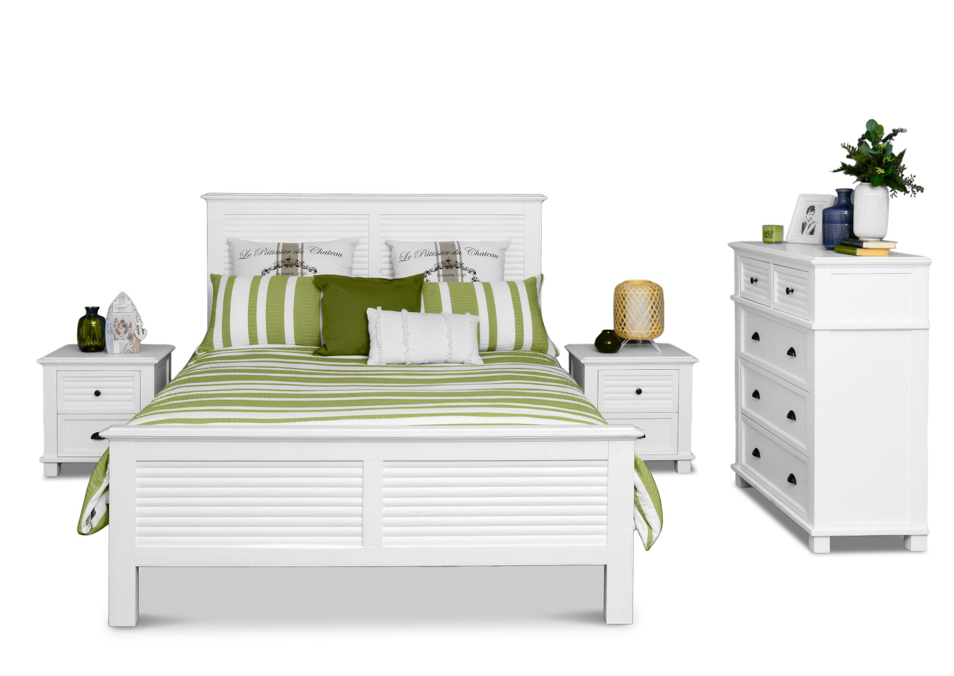 The Palm Cove Range blends Hamptons elegance with tropical living. The bedroom set is made up of: