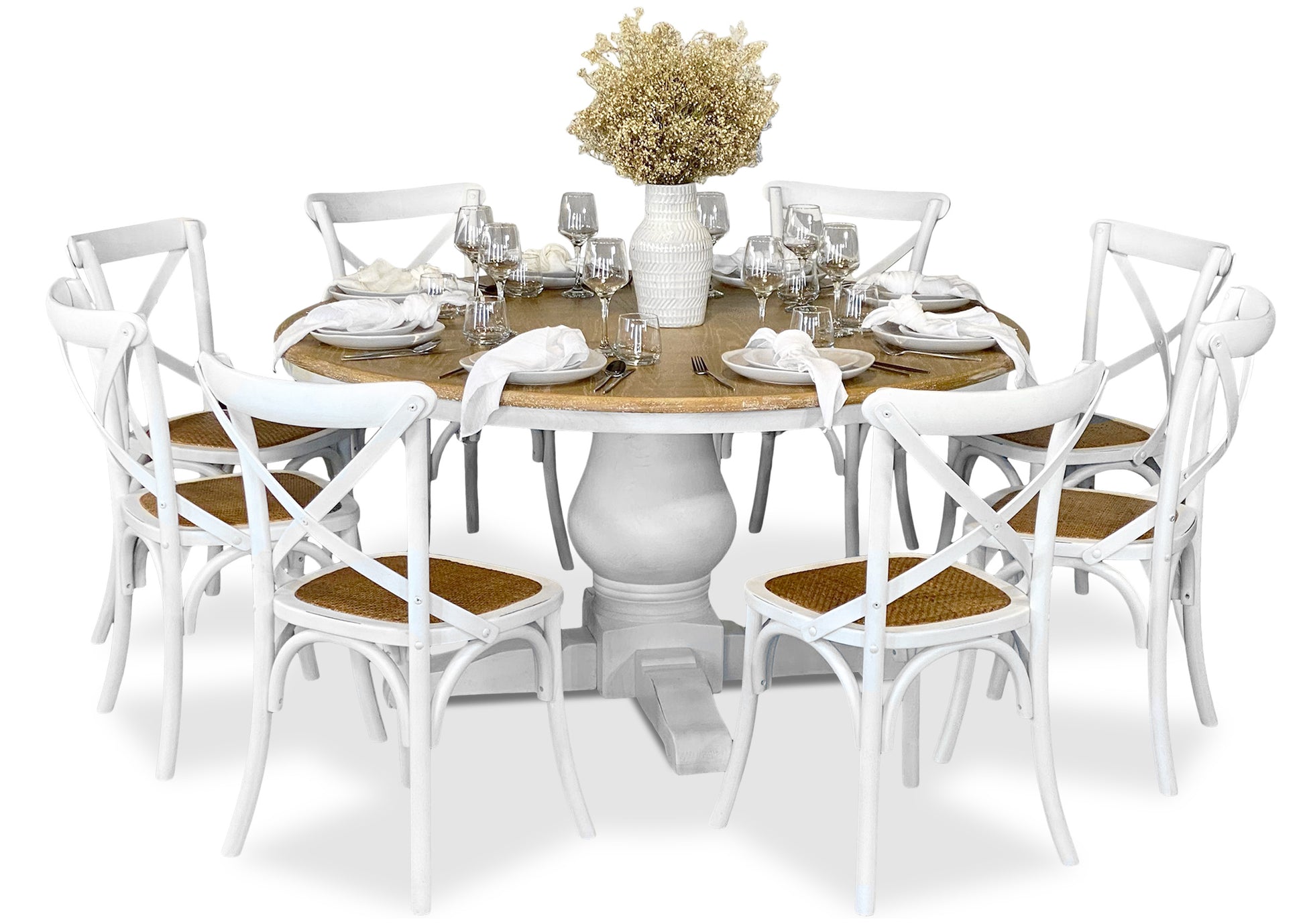 | Pieces | 1 x Parisienne Dining Table (1500mm) - White 6 or 8 x Cross Back Chairs |