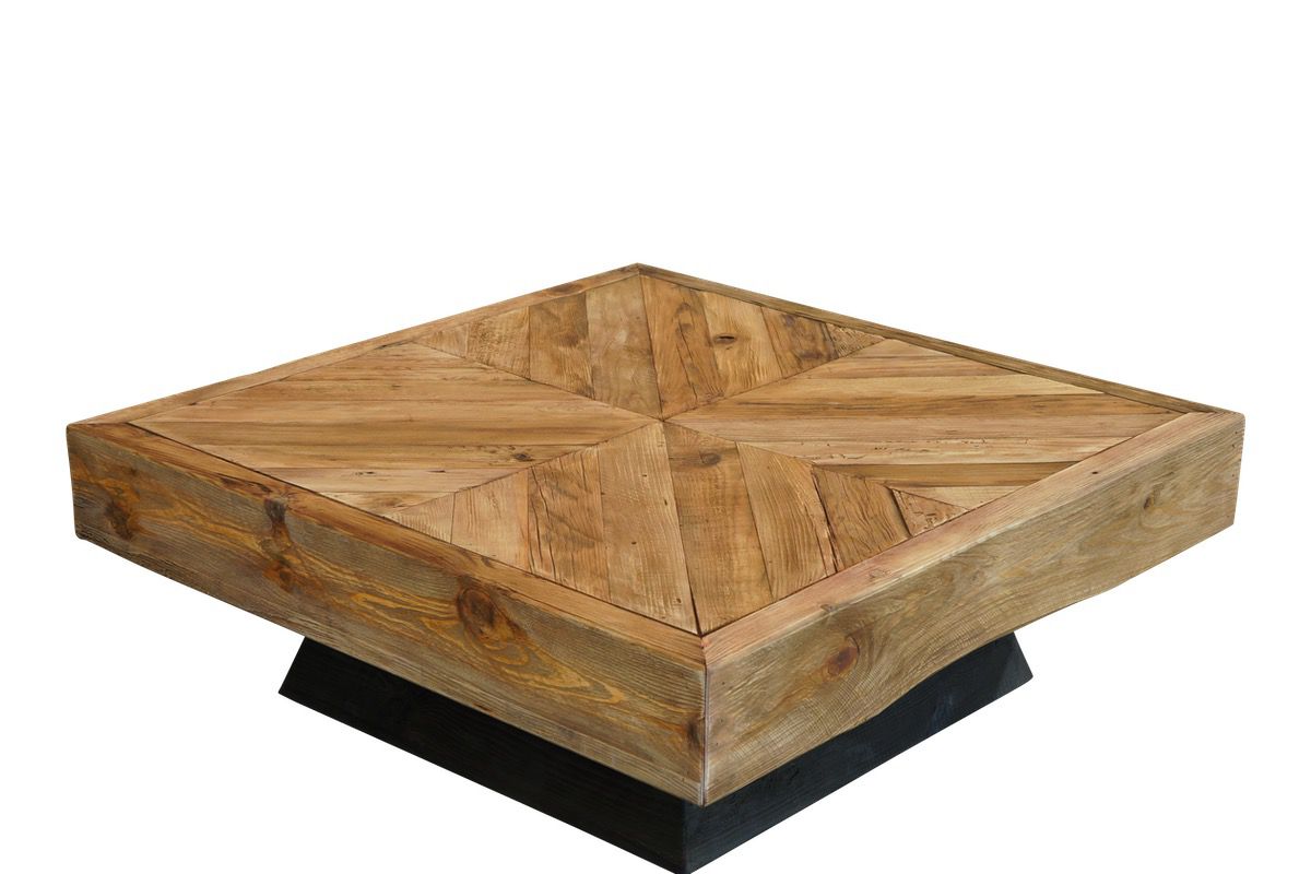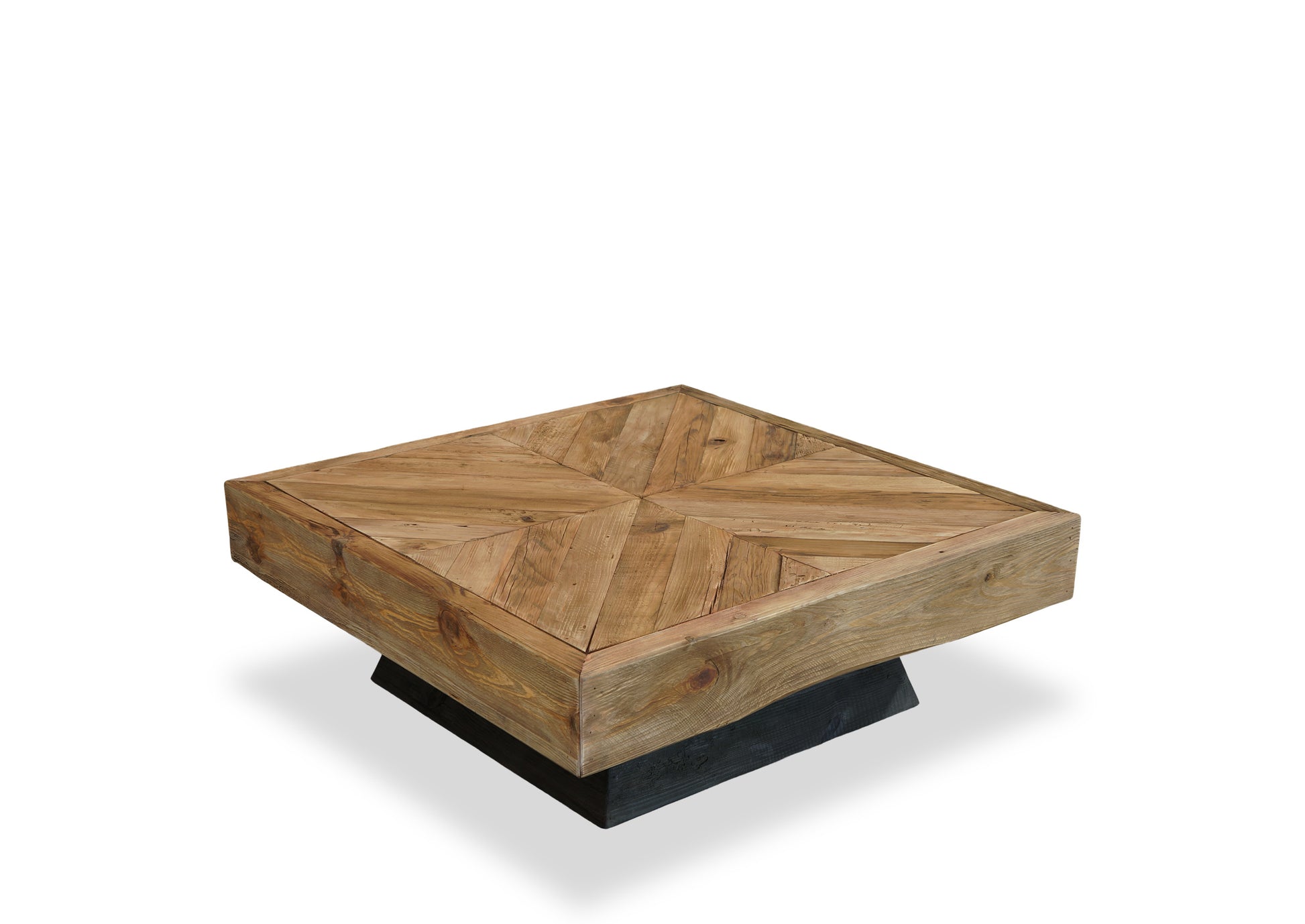 The Plantation Coffee Table is a modern rustic piece with a thick table top and pyramid base.