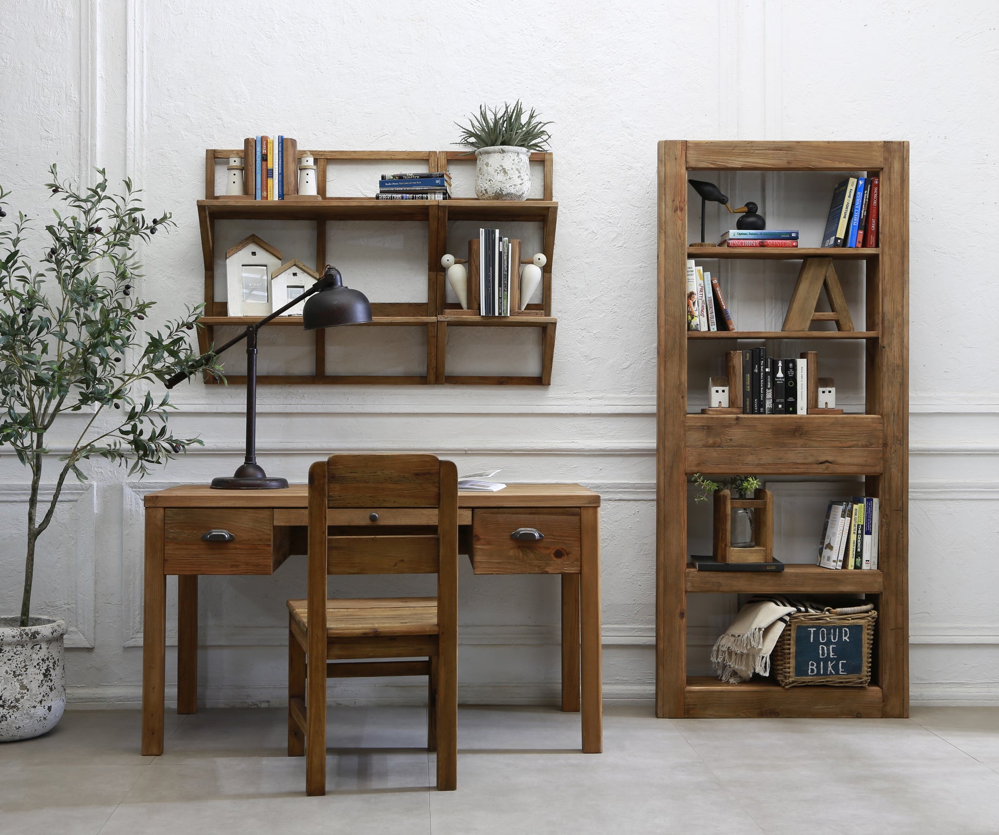 The Plantation Desk is a chunky recycled pine desk. It comes with its legs off. There are two deep drawers and one shallow pen drawer.