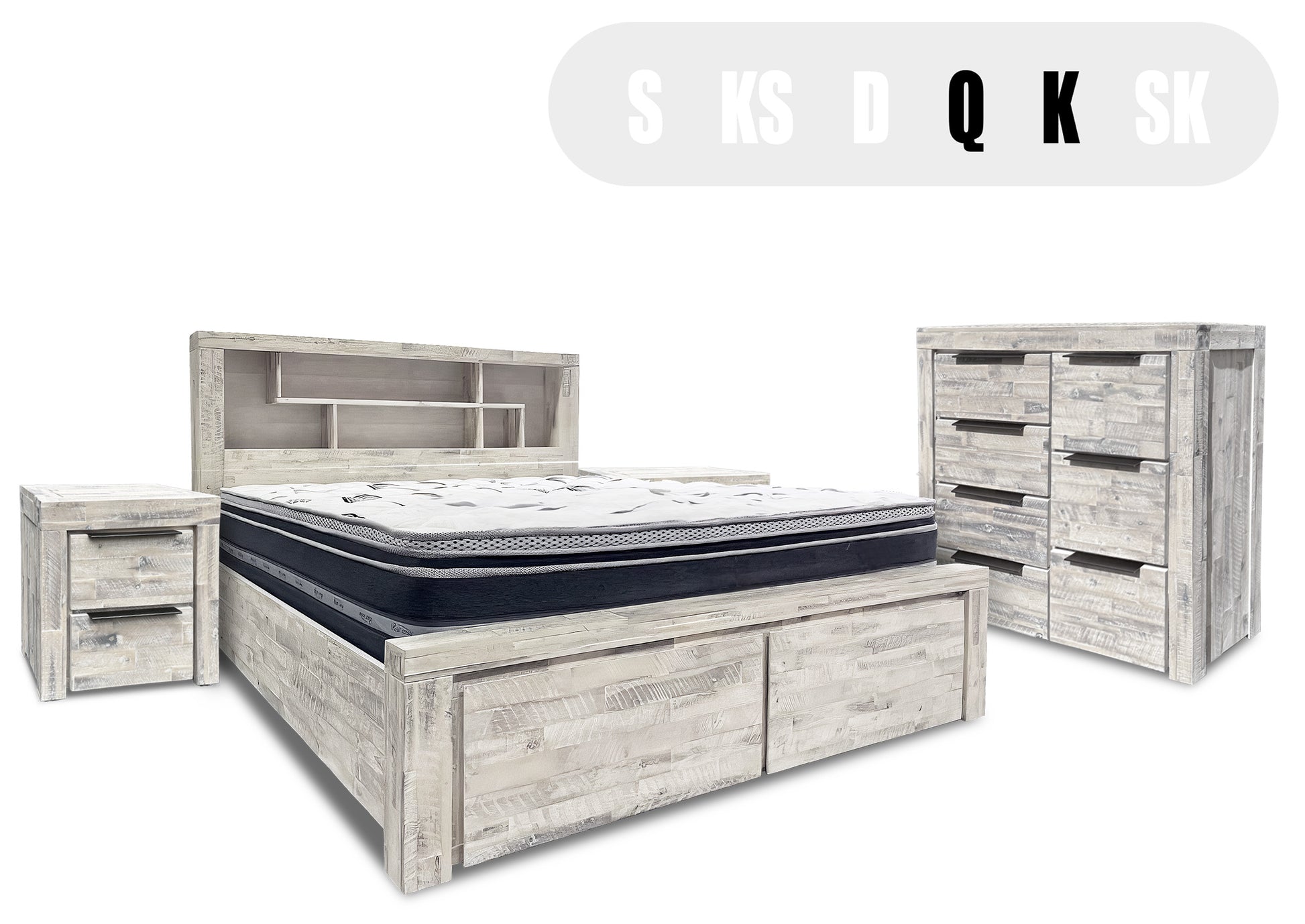 Introducing the Sanctuary Range: a coastal whitewash bedroom collection blending practicality and charm. The focal point, the Sanctuary bed, features a unique bookcase bedhead for storage and style. Crafted from durable knotty acacia hardwood, its rustic charm is accentuated by the coastal whitewash finish. With clean lines and thoughtful design, it seamlessly integrates into any bedroom decor, offering a timeless sanctuary for relaxation.