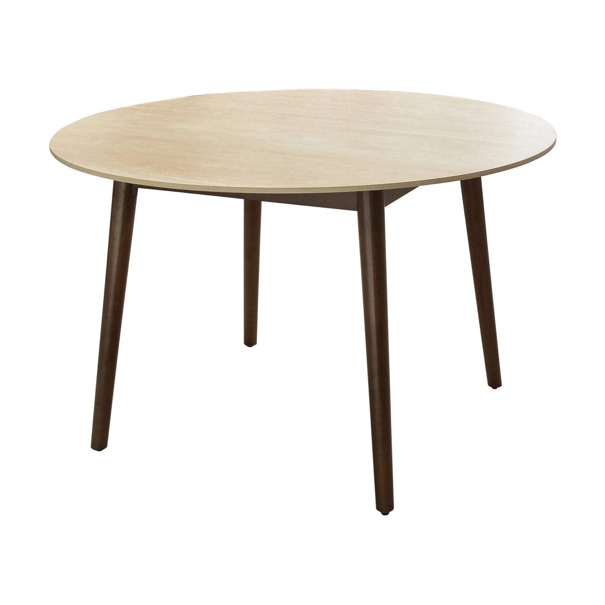 The Vesper Round Dining Table is a lesson in understated elegance, designed to bring a touch of organic luxury to the center of your dining room. It features a circular travertine-style stone top that showcases soft, swirling neutral tones, offering a durable yet high-end surface for daily use. The tabletop is supported by a rich, dark timber frame with sleek Mid-Century Modern tapered legs that provide a striking tonal contrast. With its compact 1200mm diameter and graceful, rounded silhouette, this table is an ideal choice for creating an inviting, Luxe atmosphere in both cozy apartments and spacious contemporary homes.